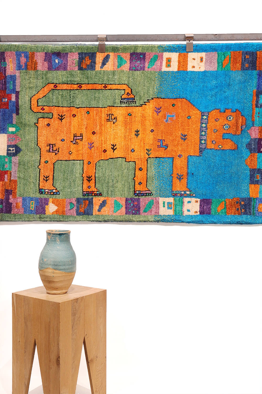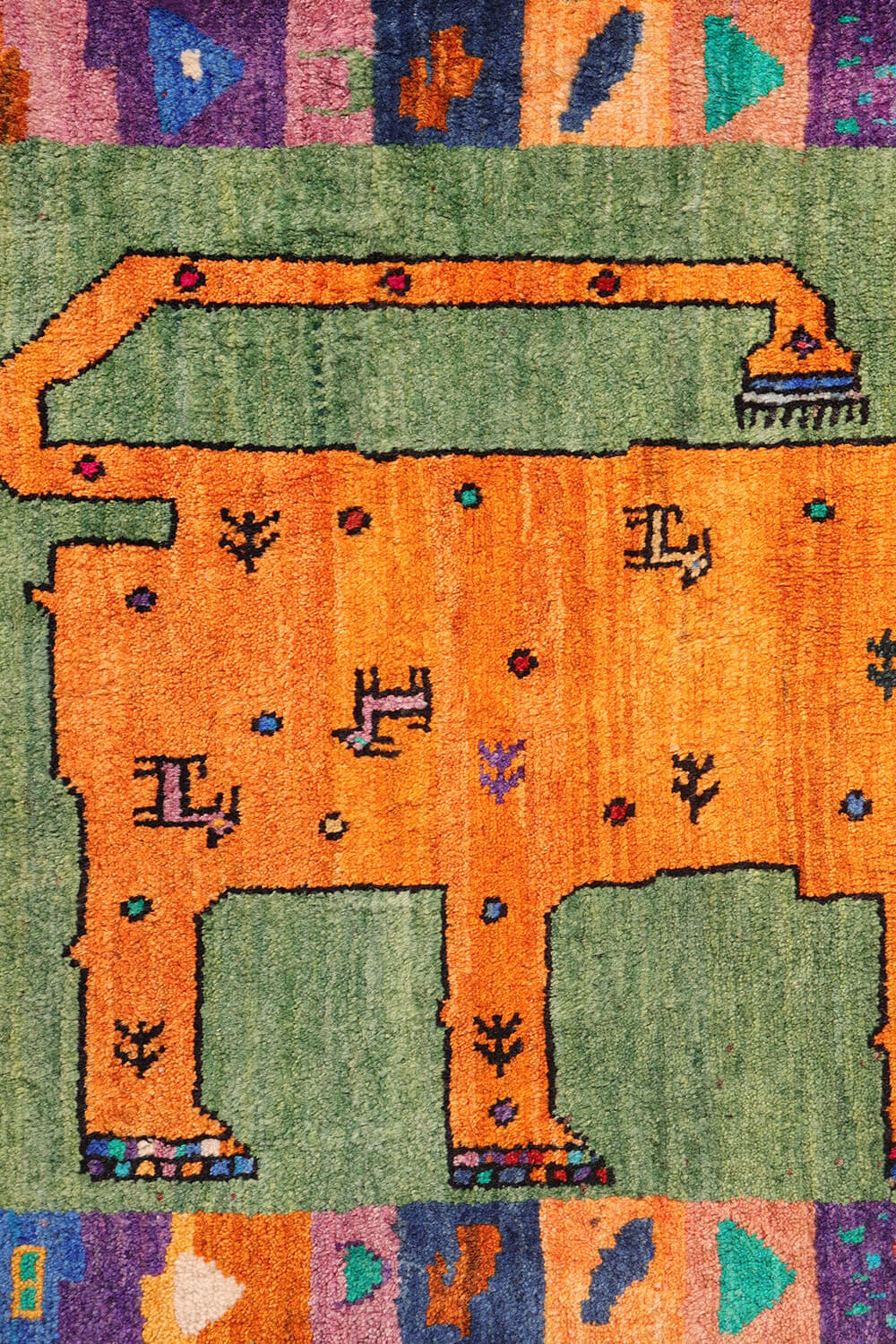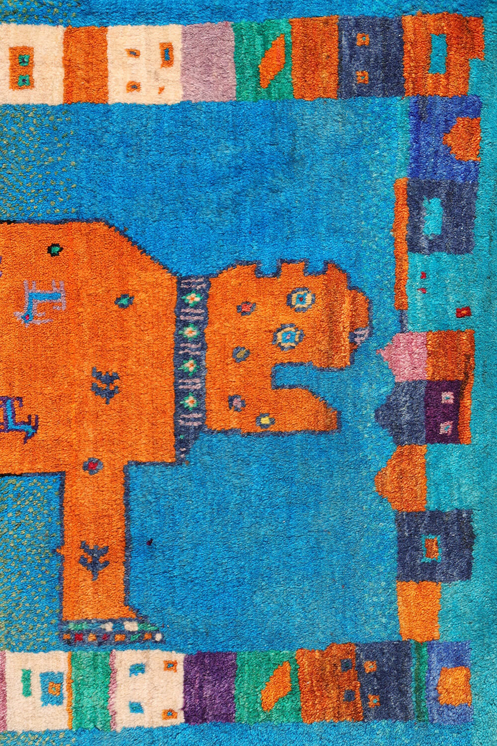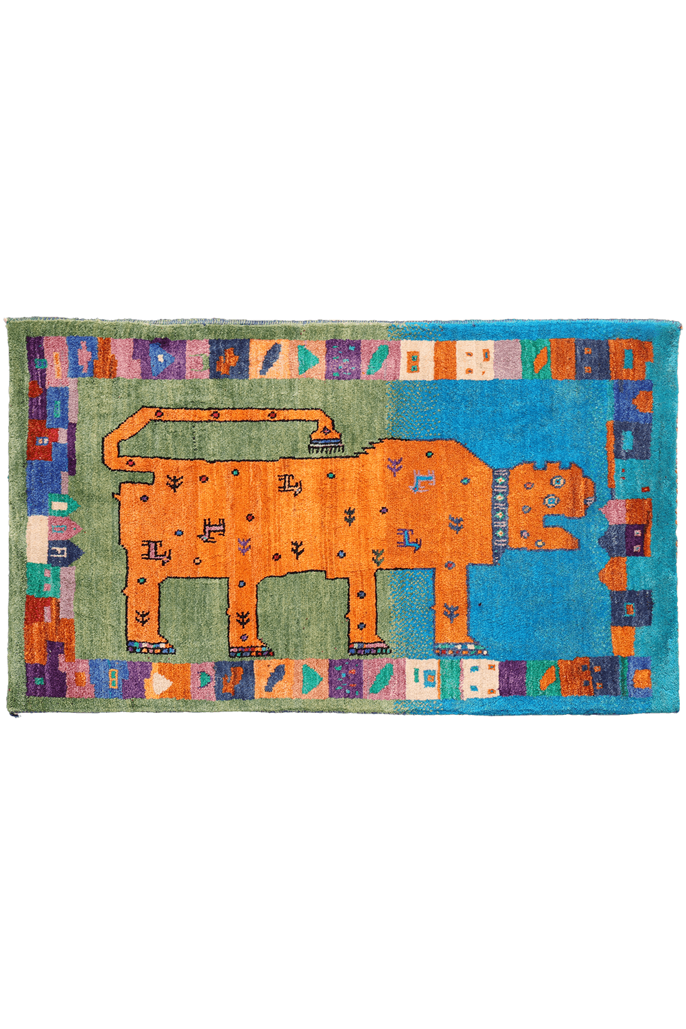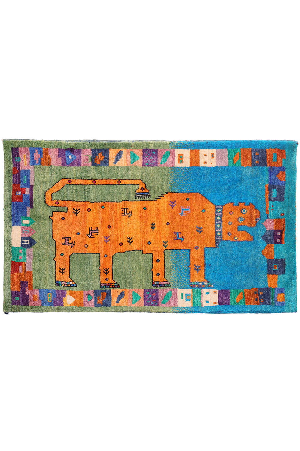 A fun and visually striking Persian lion gabbeh rug whose bold, abstract design may remind one of Picasso’s work, though it arises entirely from the weaver’s own creative vision. The lion’s face is highly expressive, giving the piece a playful and artistic personality. Its body is charmingly decorated with goats, bushes, and round dotted motifs. Particularly delightful is the way the weaver has portrayed the lion’s claws—full of bright, vivid colours that enhance the rug’s lively character.