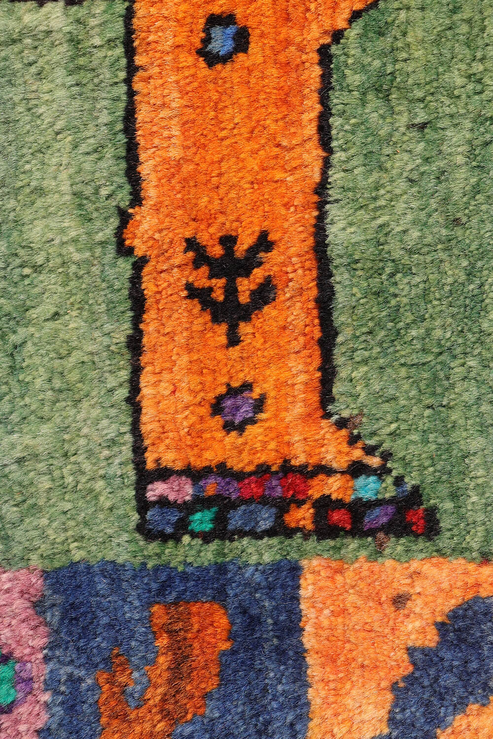 The border continues the rug’s improvised and imaginative aesthetic, with an asymmetrical and colourful composition that perfectly complements the spontaneity of the central design.