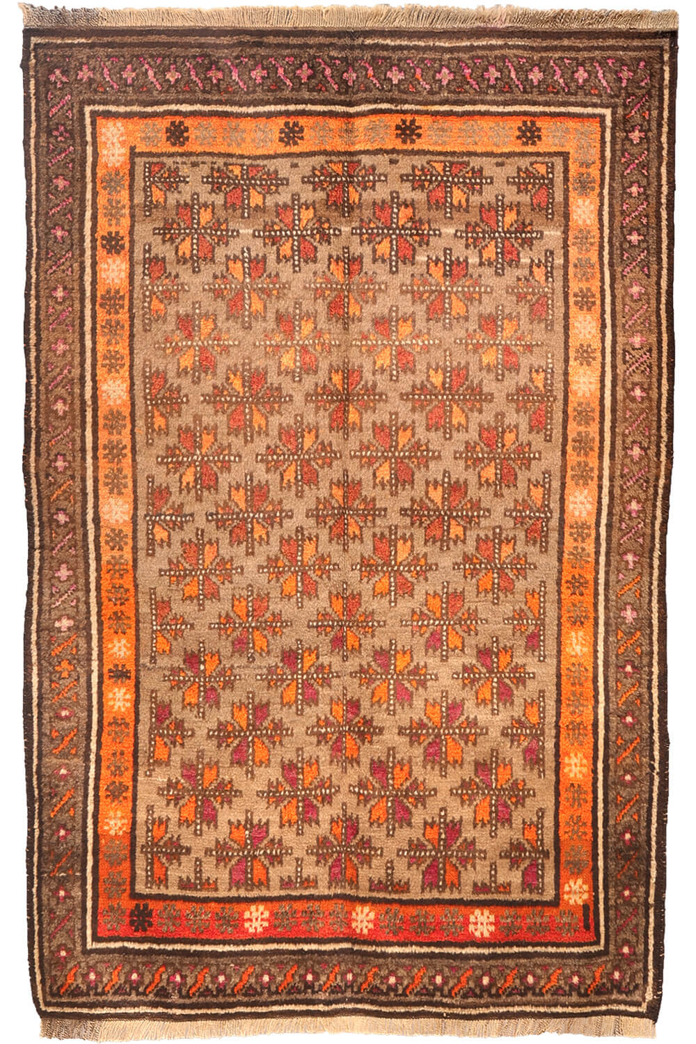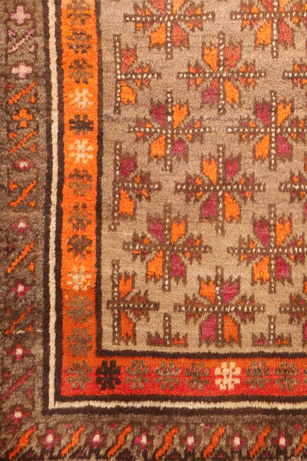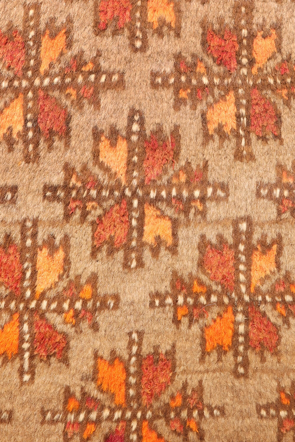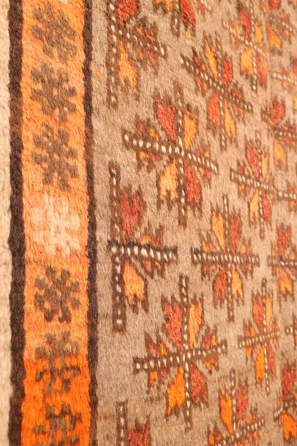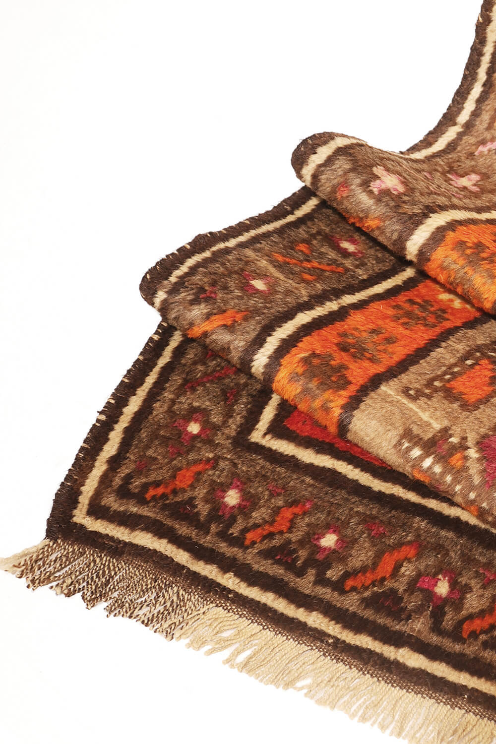 A Taimani Baluch rug from Afghanistan featuring a field woven in undyed grey wool. Set against this calm, neutral background, a series of leaves in warm autumn colours are arranged across the design. The composition suggests that the weaver had a deep appreciation for nature, as she also included charming small flowers in both borders.