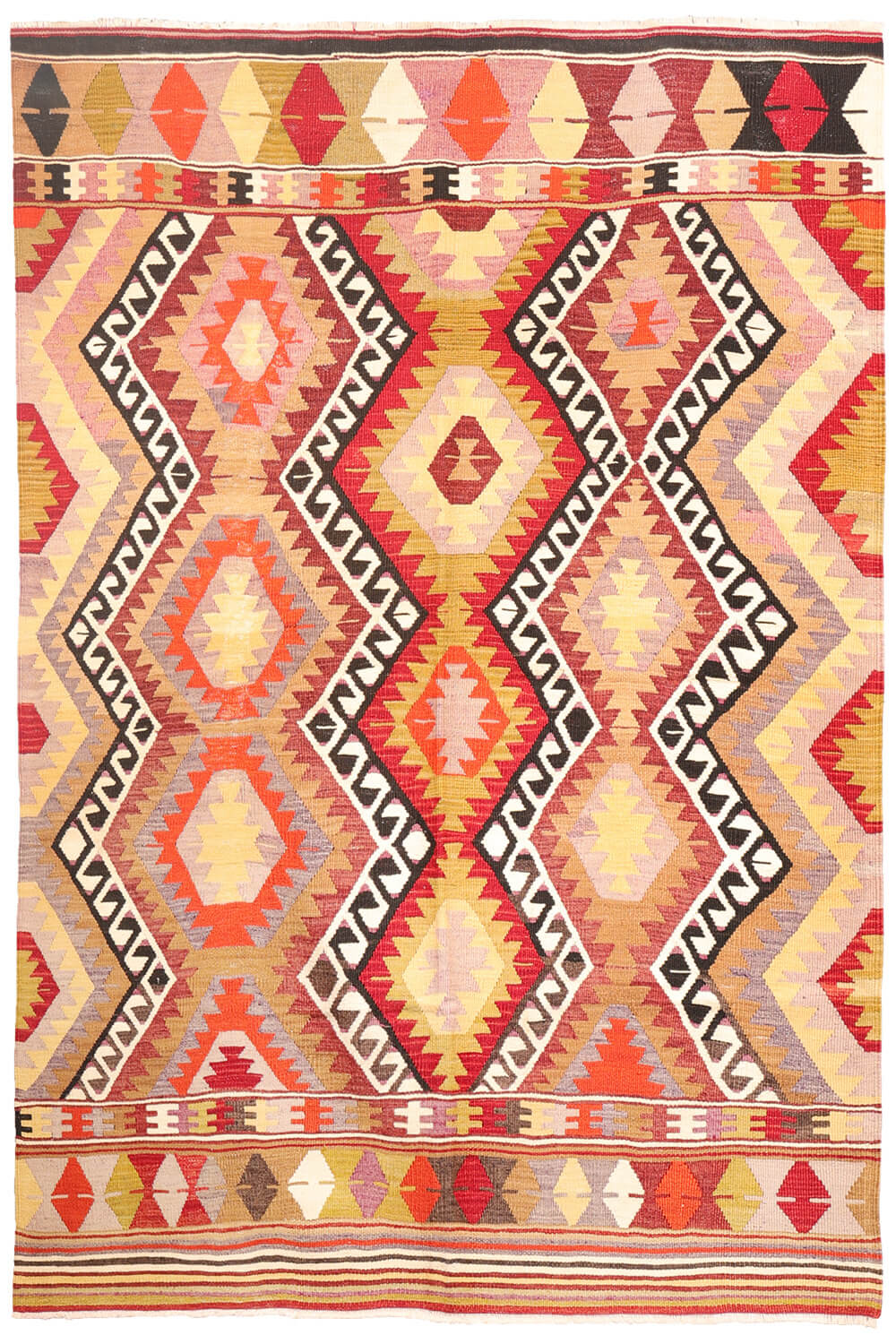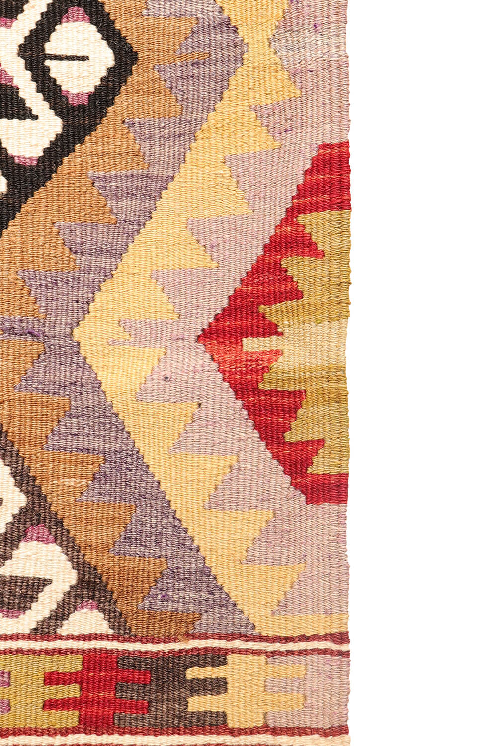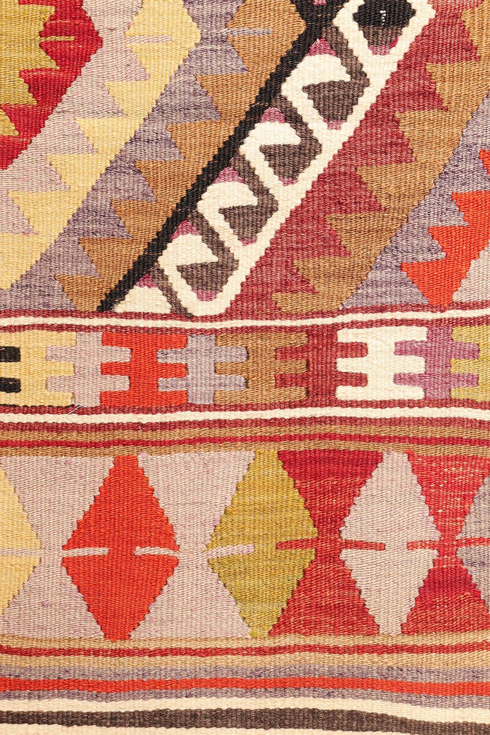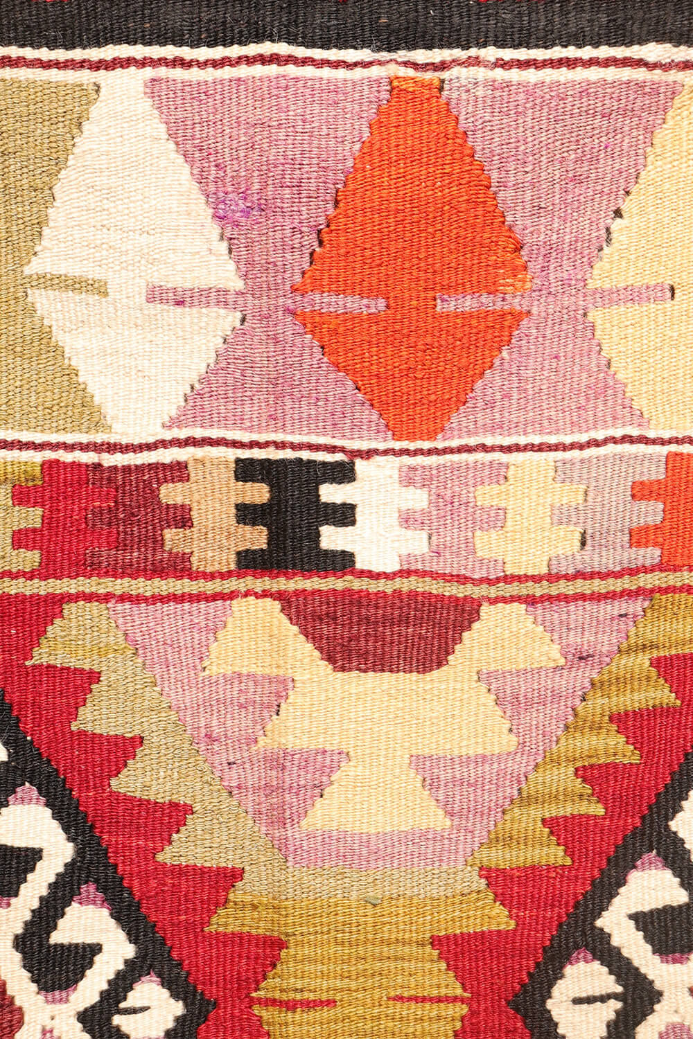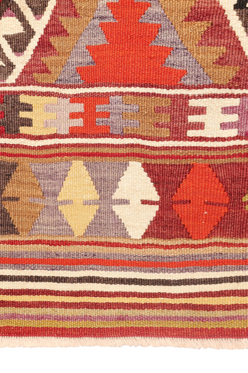 This kilim features a wide, open main field arranged in vertical columns filled with serrated lozenges. Borders appear only on the two longer ends, allowing the design along the wider sides to visually extend beyond the kilim’s edges.