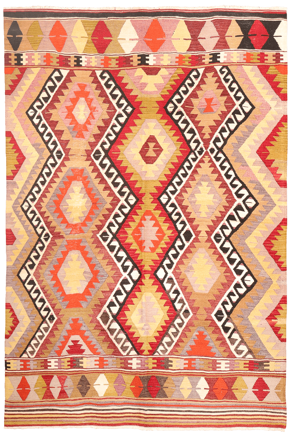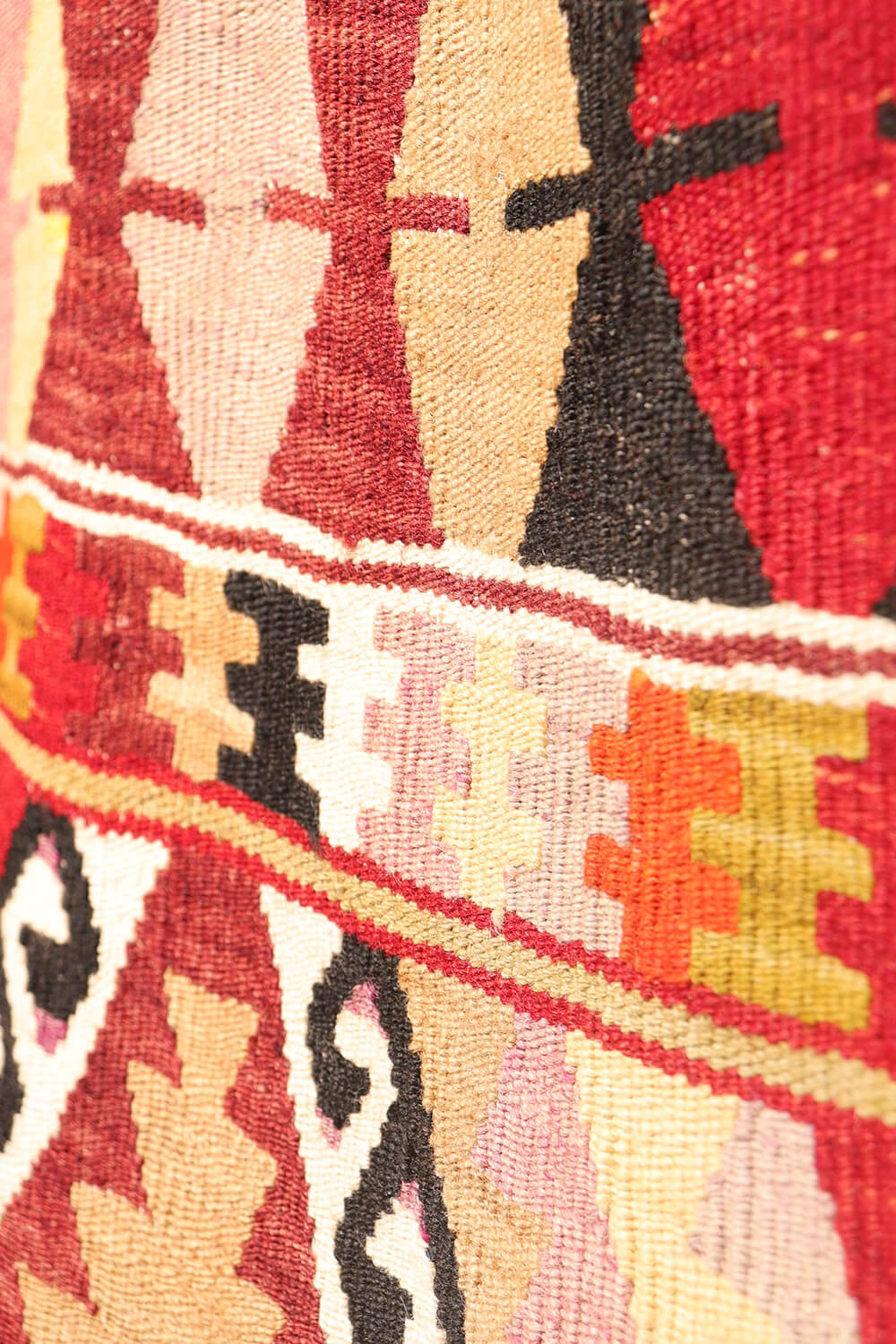This kilim was hand-woven on a simple loom by a village or nomadic weaver for her own use. Probably the weaver used wool from her own sheep. The wool was first cleaned, then hand-carded, hand-spun and finally dyed by hand, often using natural dye materials like roots, nuts, berries, fruits, flowers and plants. Kilims from the last quarter of the twentieth century mostly use synthetic dyes. This kilim would have taken many months to complete.