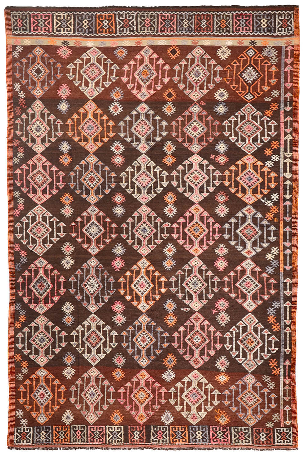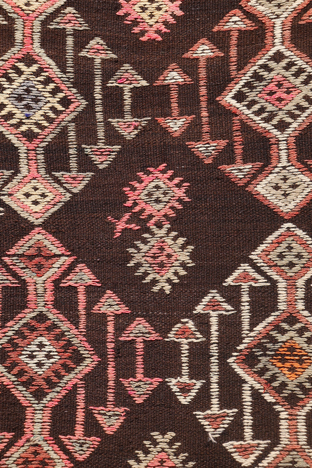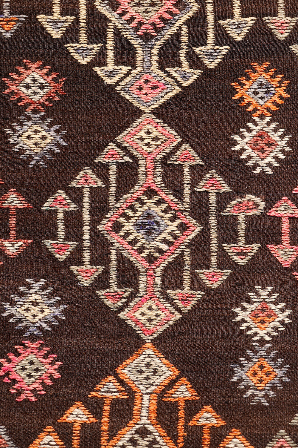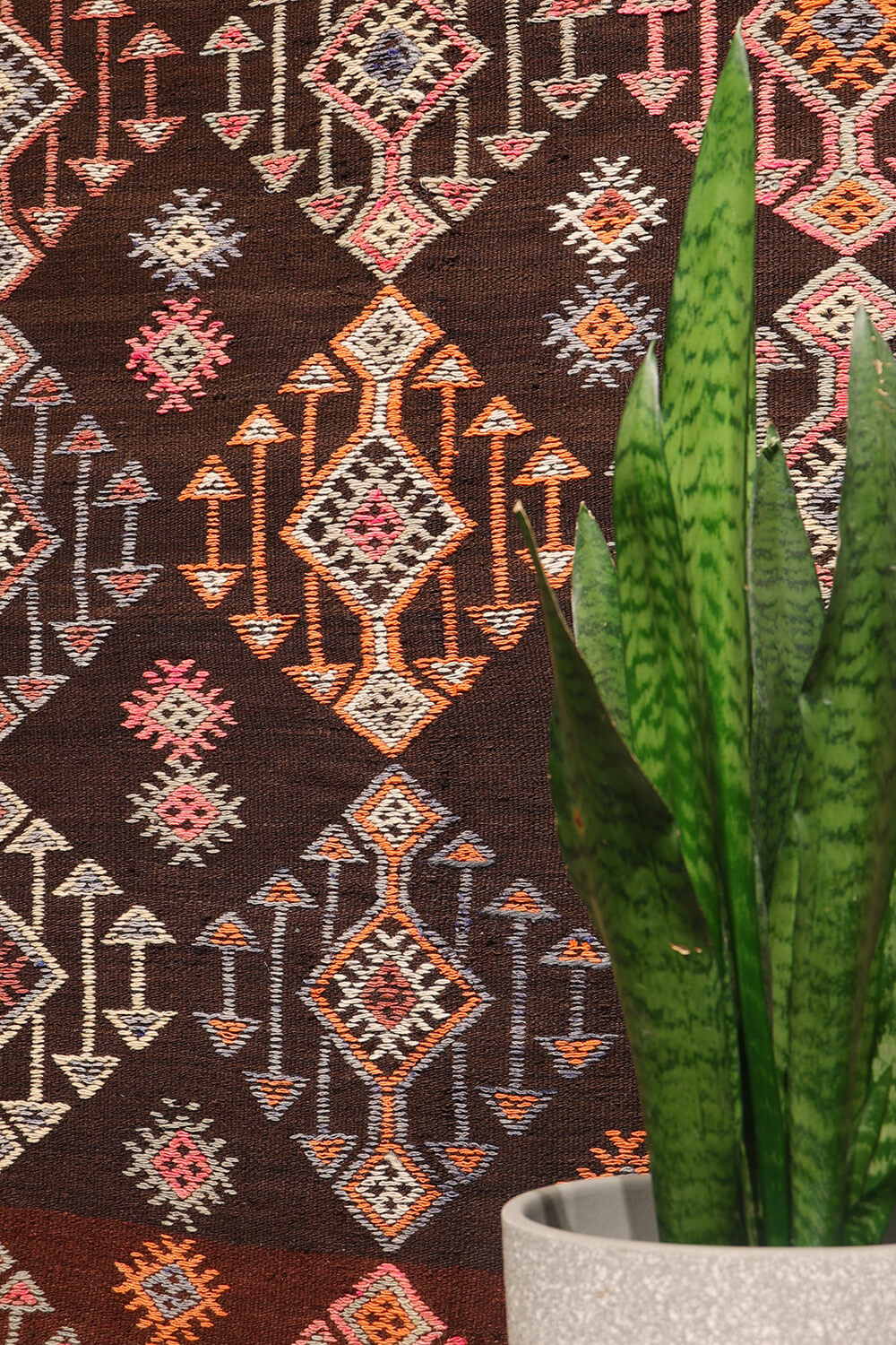 This vintage kilim from the Çanakkale region features a stylish dark brown background that sets a bold, modern tone. The design is brought to life with vibrant touches of fuchsia, orange, and greyish blue — skillfully added using the cicim technique, where extra weft threads create textured, decorative motifs.