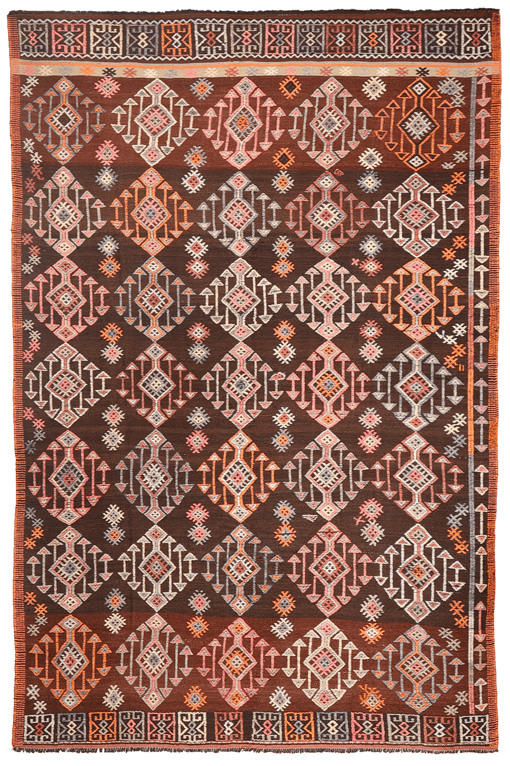 Kilims or Gilims are flatwoven textiles with a woollen weft on a woollen, goat hair or cotton warp. There are many different techniques and designs. The weaver normally works within a tradition of techniques, motifs and designs specific to a particular area or ethnic group. The designs relate to her natural surroundings, protection, fertility and the harmony of family relationships. Each weaver adds something from her own creativity and sense of composition. Kilims are often woven as part of a marriage dowry and can be used to create many different objects like storage bags, horse-blankets, baby carriers, blankets and wall and floor coverings.