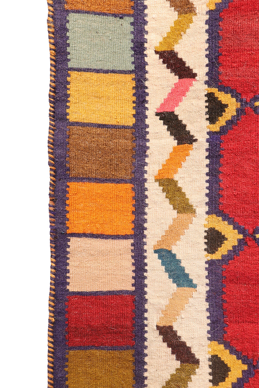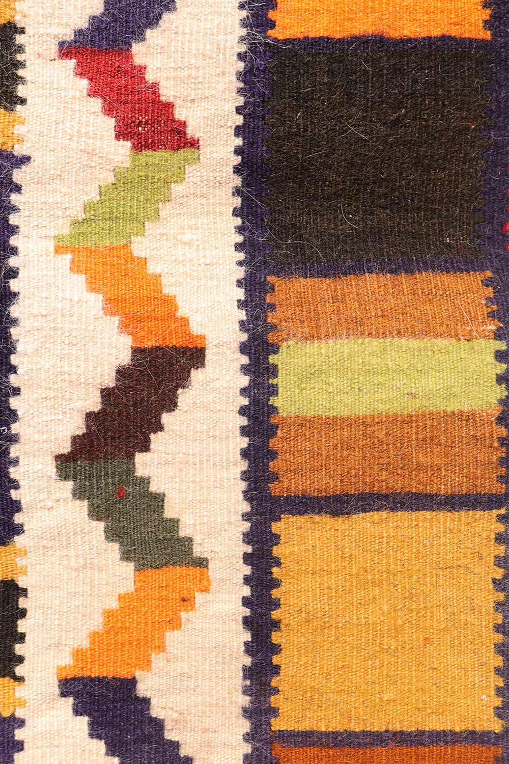A lively and fun‑looking vintage Qashqai kilim from Iran featuring a flat‑woven tapestry structure typical of tribal rugs from the Qashqai people of southwestern Iran. The central field is adorned with repeated geometric patterns in alternating hues. . One of the borders is composed of a series of square motifs, while the other border displays a colorful zig‑zag design as its main motif.
