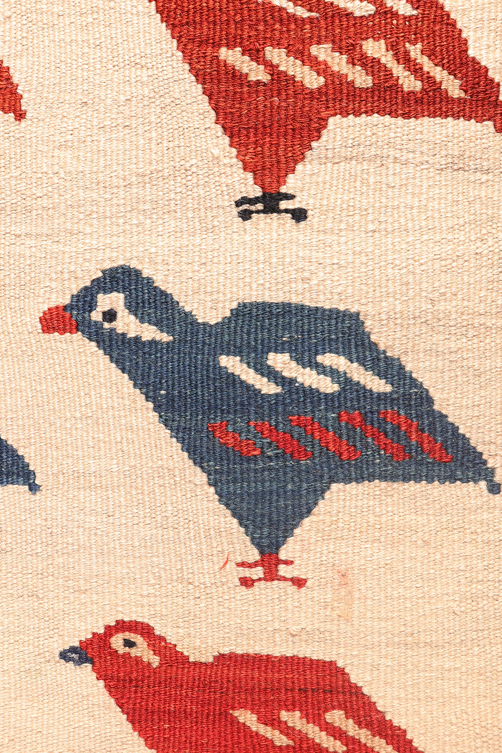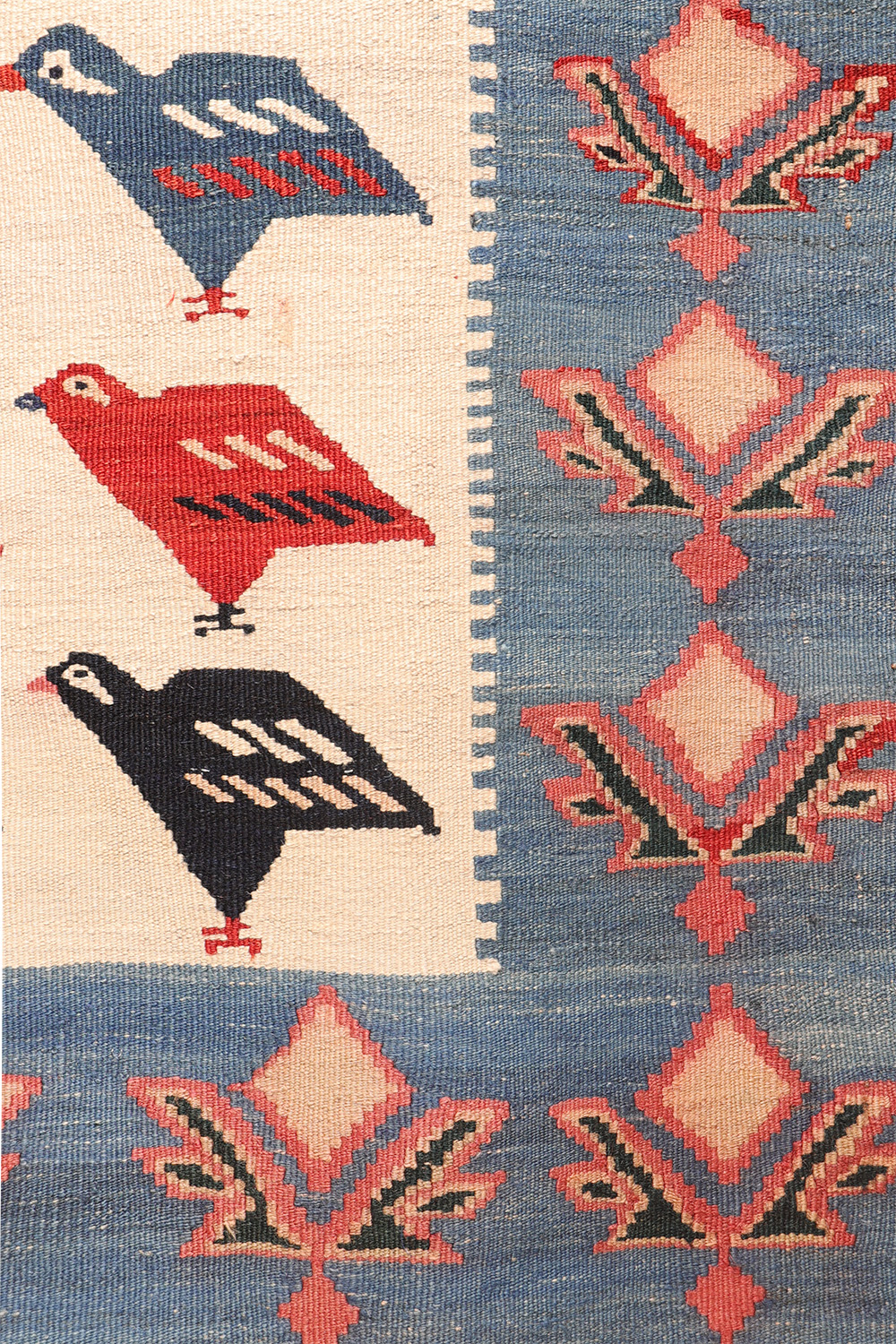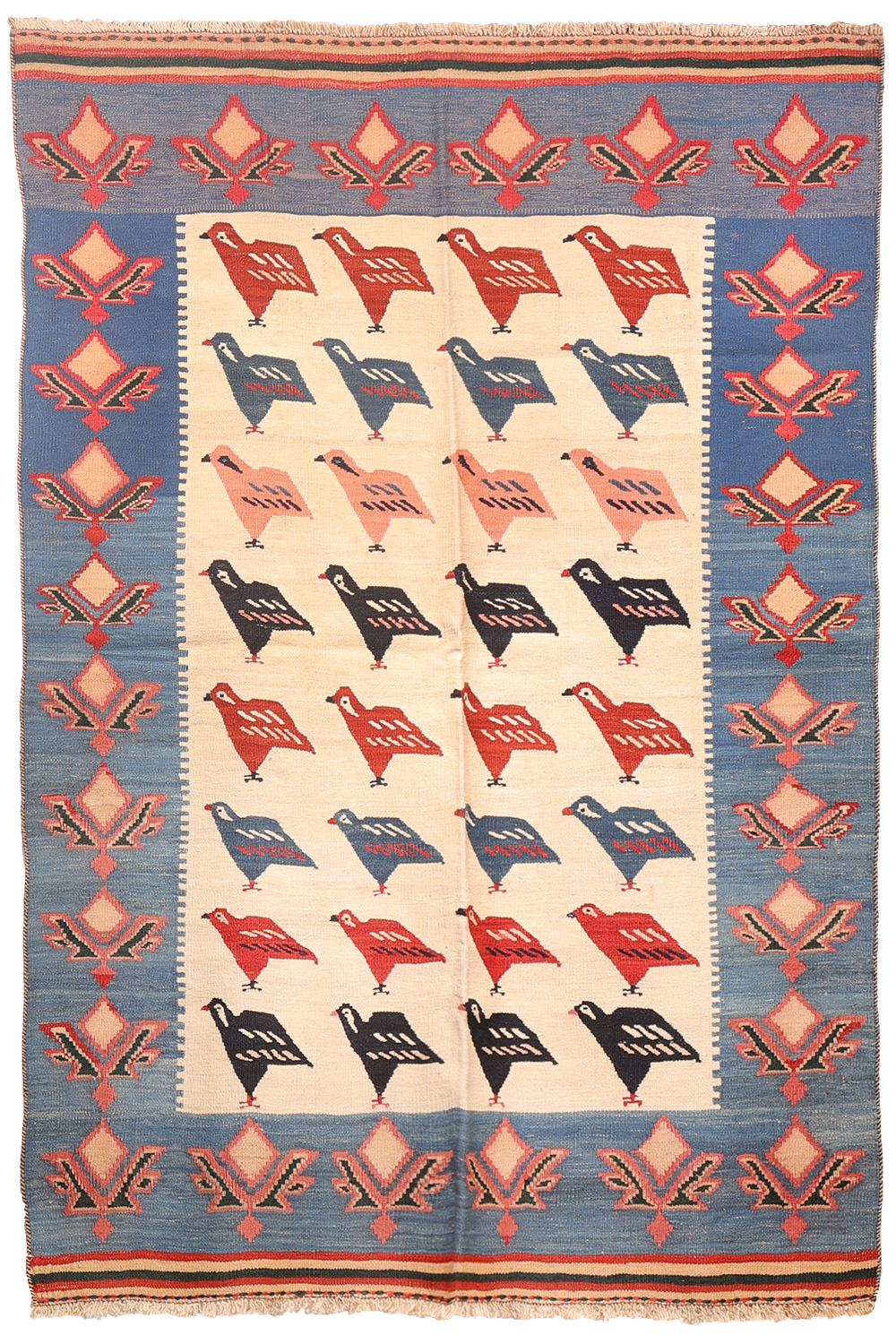A vintage Qashqai kilim from Iran featuring a charming flock of chicks. The main field has an undyed white wool background, providing a crisp contrast to a few rows of motifs resembling partridges. The border showcases an oversized plant motif, repeated continuously around the edge.