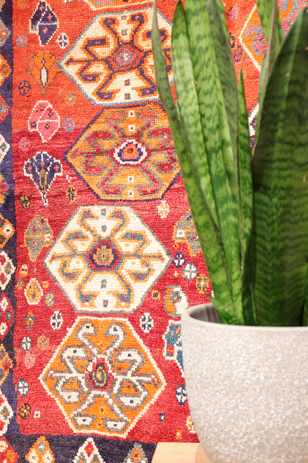 Among the geometric patterns, you’ll find charming woven details of bushes, flowers, and native plants, reflecting the natural world that inspires Qashqai weaving. The rug displays a beautiful abrash—natural color variation that occurs during the dyeing process—giving the piece depth and a unique, organic feel.