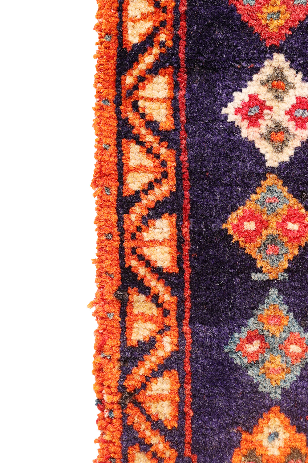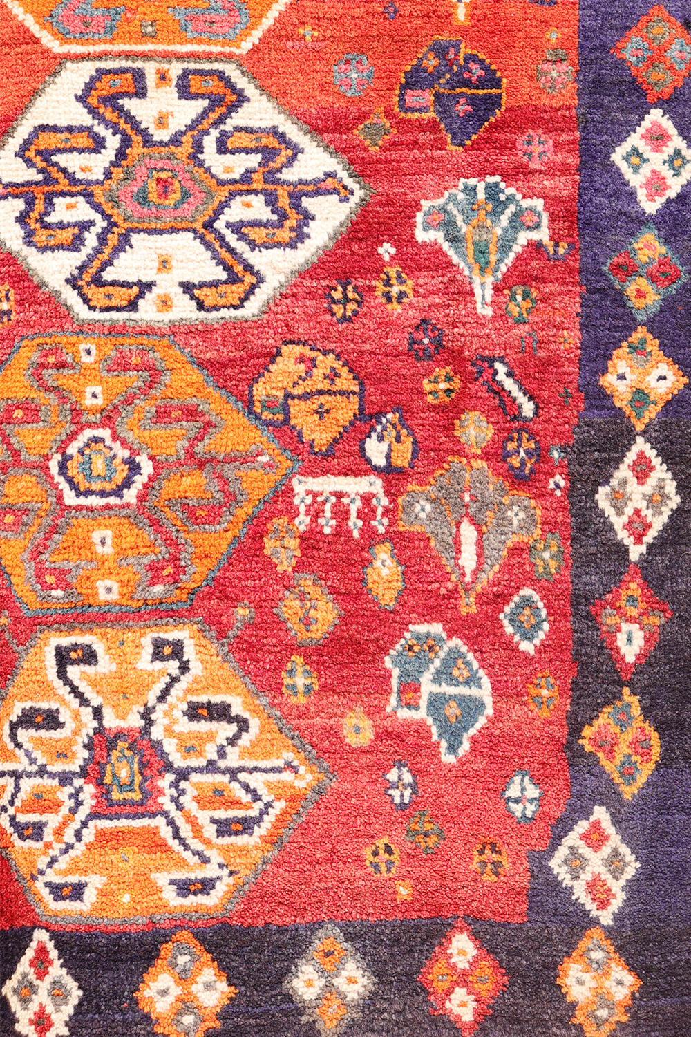 Add warmth and character to your space with this vintage Qashqai rug, featuring a lively design that closely resembles a traditional Qashqai kilim. Handwoven by tribal artisans, the rug’s central field showcases the classic Qashqai emblem, repeated across the surface—each variation brought to life with different vibrant color combinations.