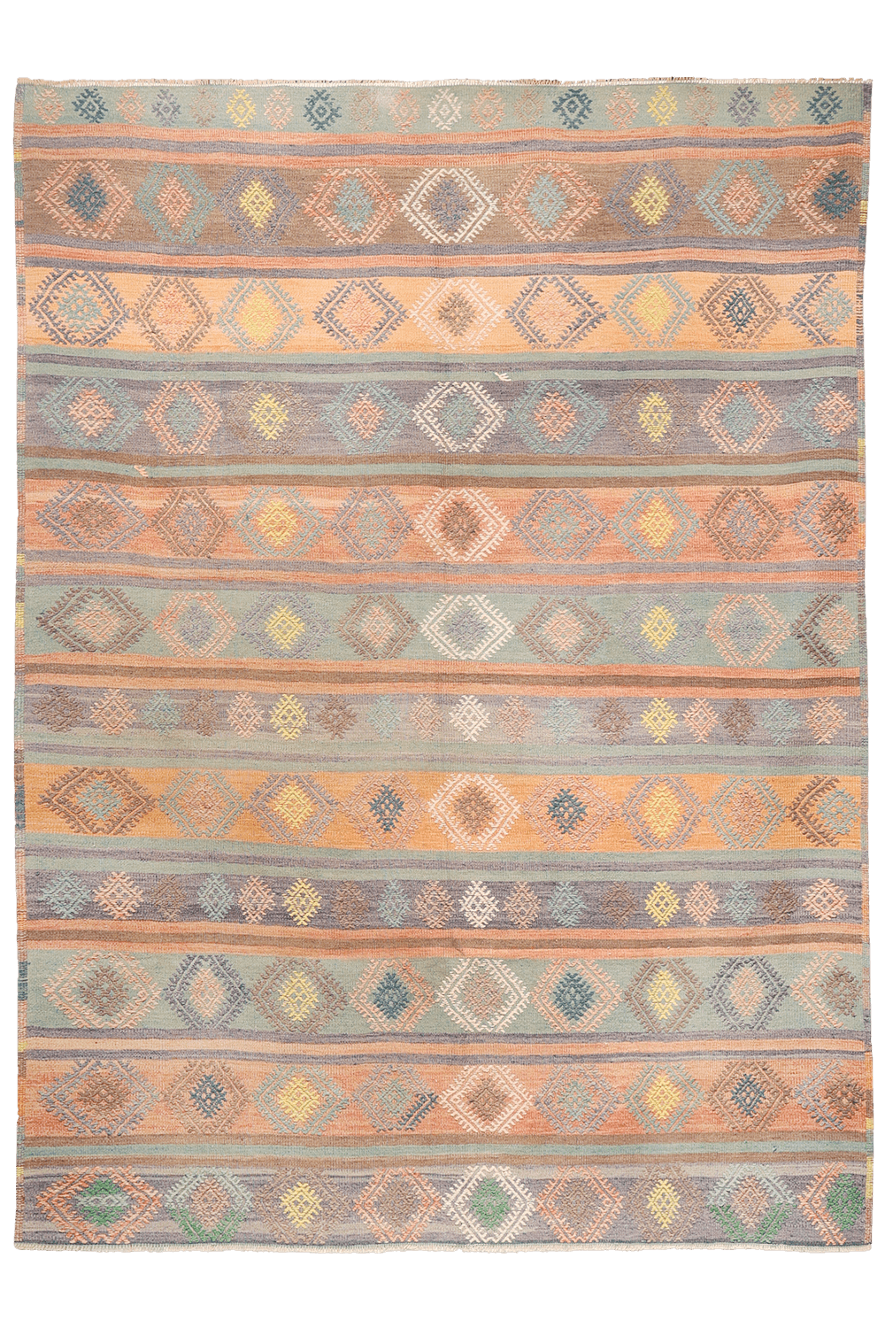 This kilim originally had a stronger colour palette and has been overdyed to create a more muted colour scheme.