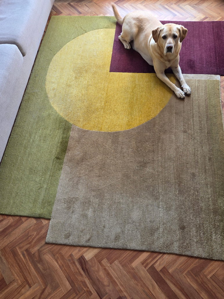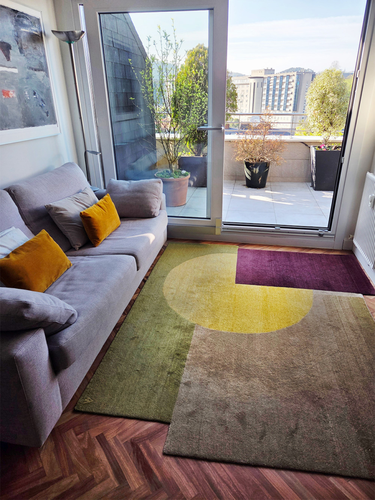 A  rug designed by the esculptor José Ramón Anda and woven in a Fair Trade workshop in Nepal looks this good in a flat in San Sebastián. “Lur” thinks that the Tibetan hand spun wool from the Tibetan High Plateau is lovely on his skin.