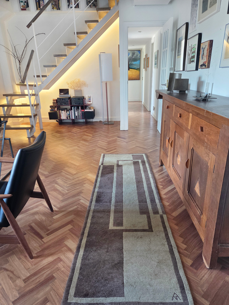 A rug designed by the Basque sculptor José Ramón Anda, and woven in a Fair Trade workshop in Nepal, looks this good in this home in San Sebastián.