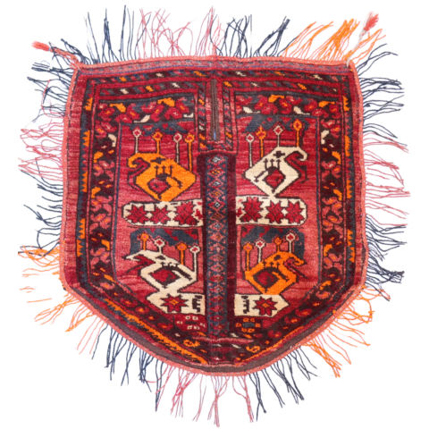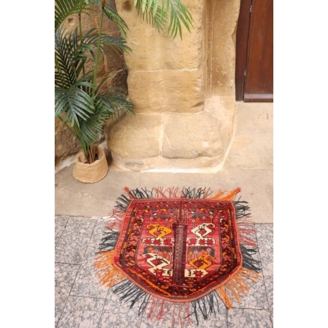 Alfombra turkmana semi antigua para la montura de caballo, Afganistán. 70×73 cms