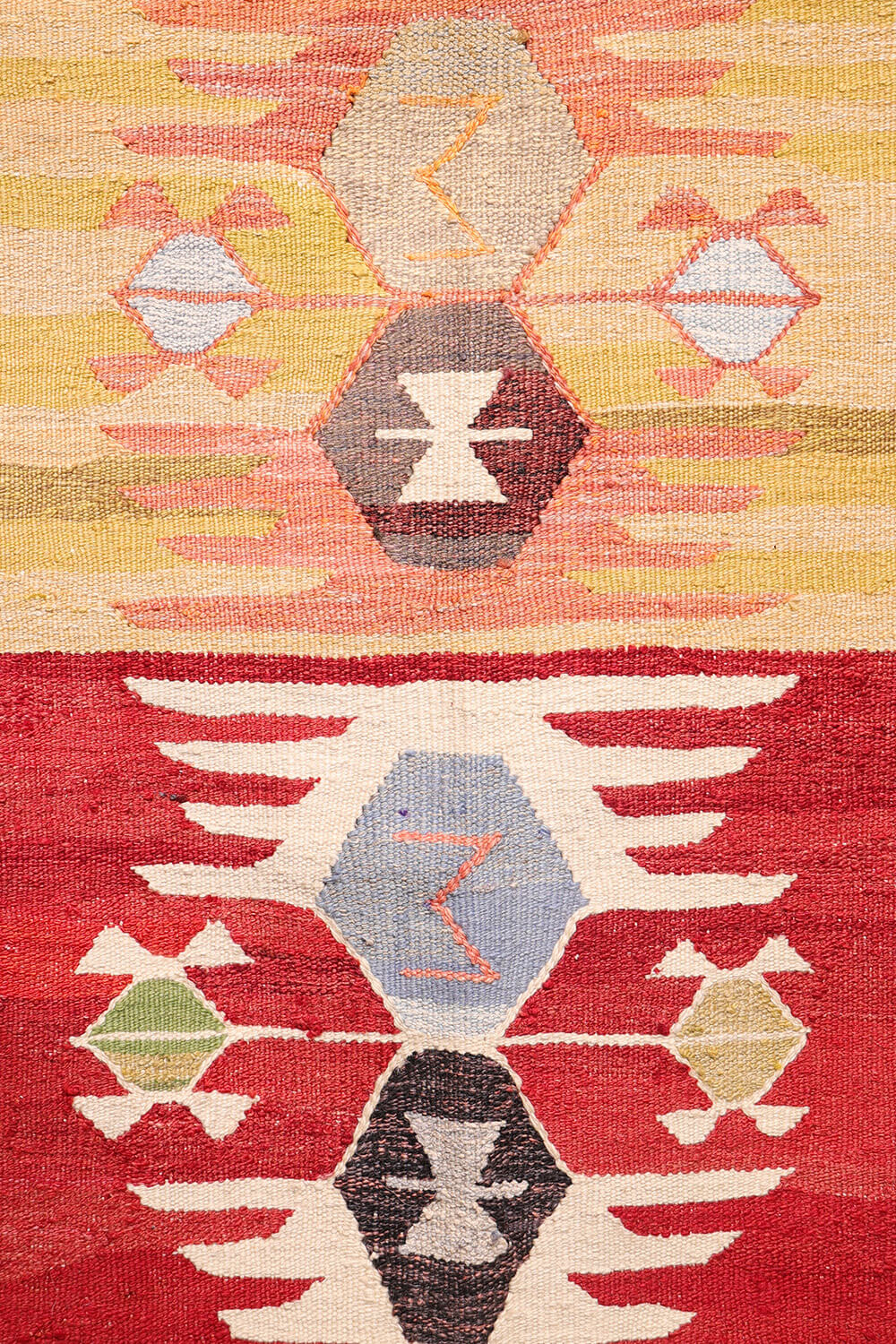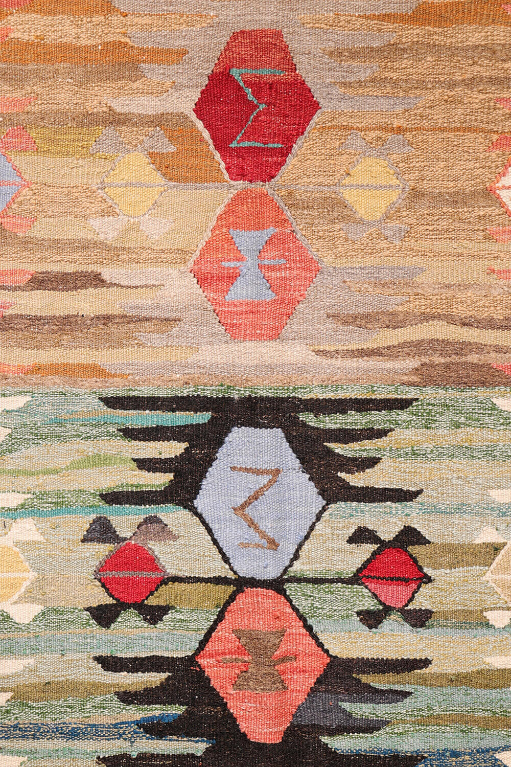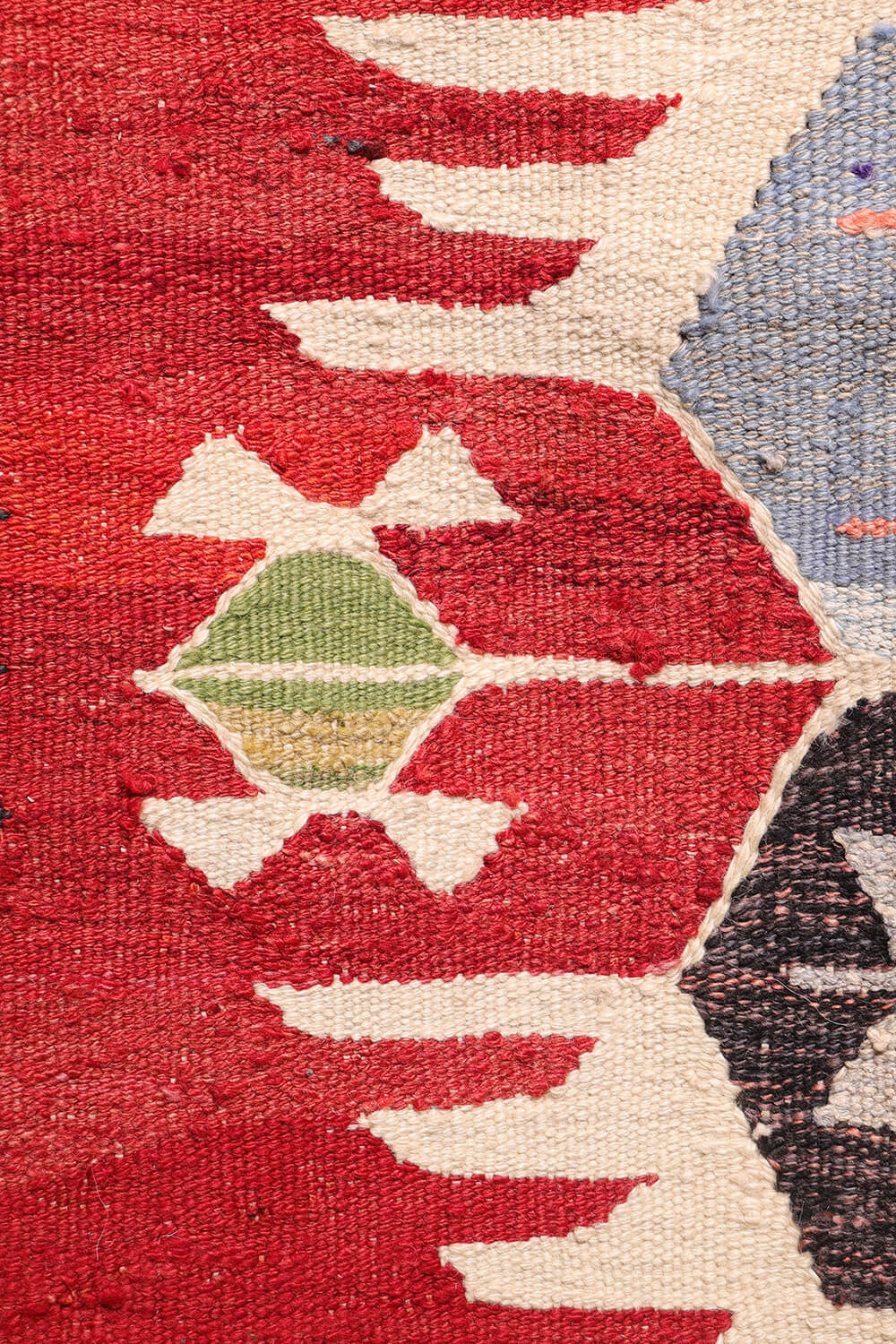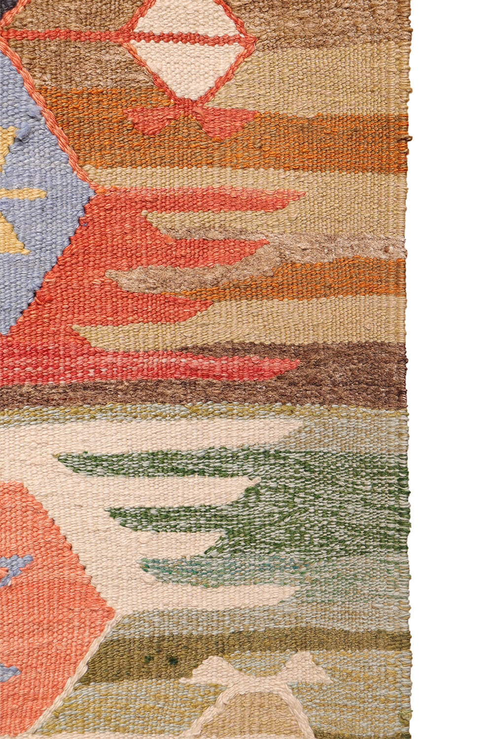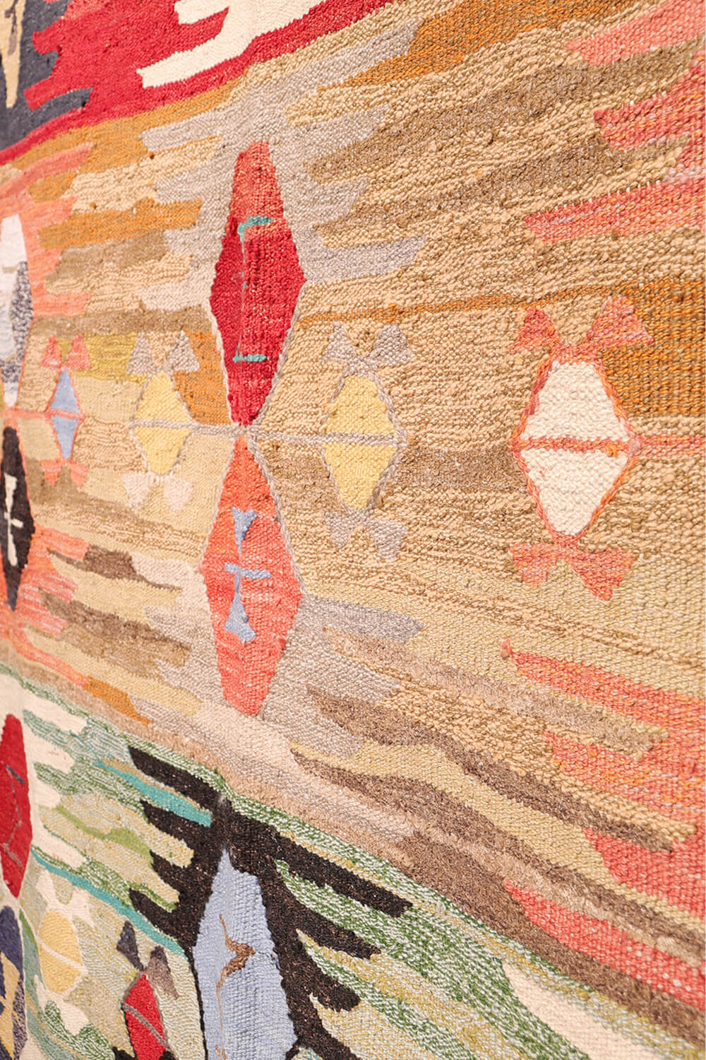 Este kilim, tejido recientemente a partir de lana recuperada en un taller de Comercio Justo, encarna un enfoque refinado del upcycling o suprareciclaje, donde convergen herencia, sostenibilidad y artesanía. Esta pieza excepcional se elabora con hilos cuidadosamente seleccionados, procedentes de kilims antiguos y vintage que están dañados o han perdido su valor comercial. Al reutilizar estos nobles materiales, a menudo teñidos originalmente con pigmentos naturales, las artesanas les otorgan una segunda vida, respetando al mismo tiempo tradiciones de tejido centenarias.