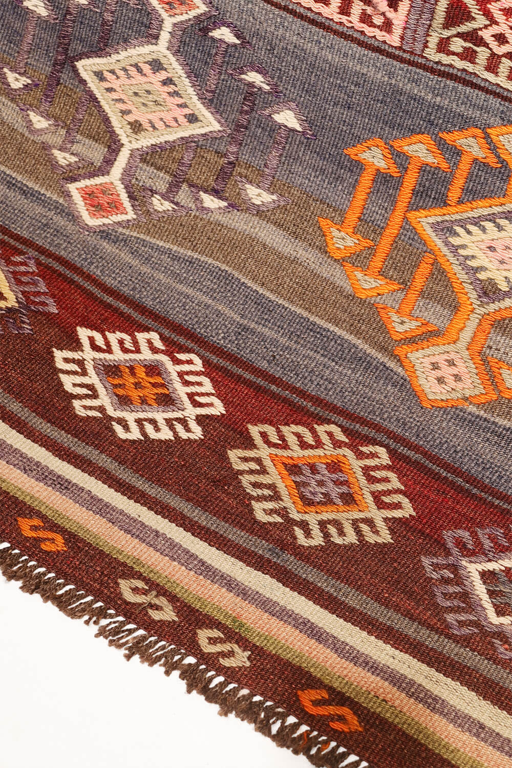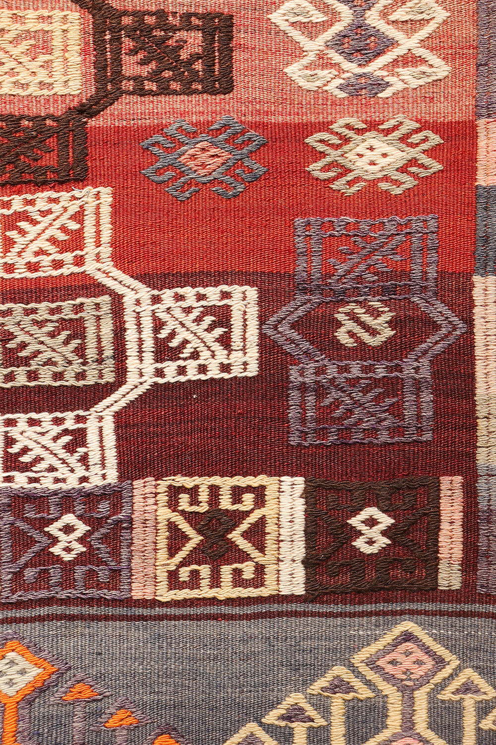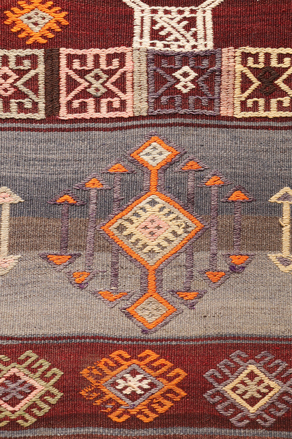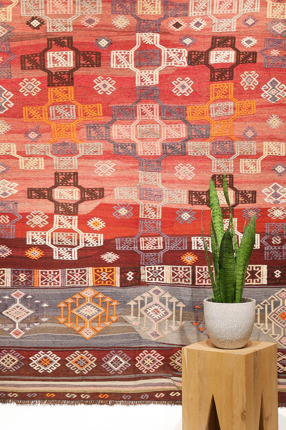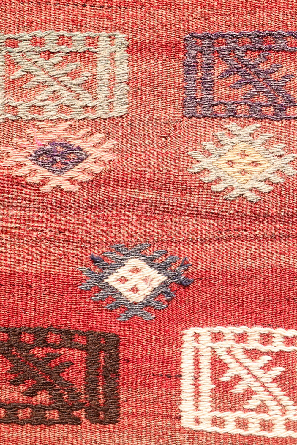 Un precioso kilim de la década de 1960 con un fondo liso decorado mediante la técnica cicim. La pieza presenta un hermoso abrash, o variación natural de color, en el campo principal: la parte superior muestra tonos rojo terracota, mientras que la inferior está tejida en colores más profundos y cálidos, como rojo oscuro y granate.