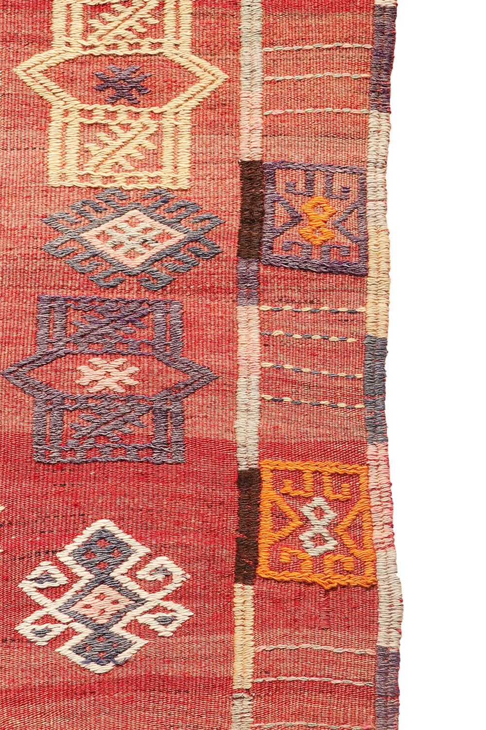 Los bordes principales se sitúan en los lados más largos del kilim, mientras que los lados cortos están enmarcados por bordes muy finos y sutiles que delimitan la composición con delicadeza.