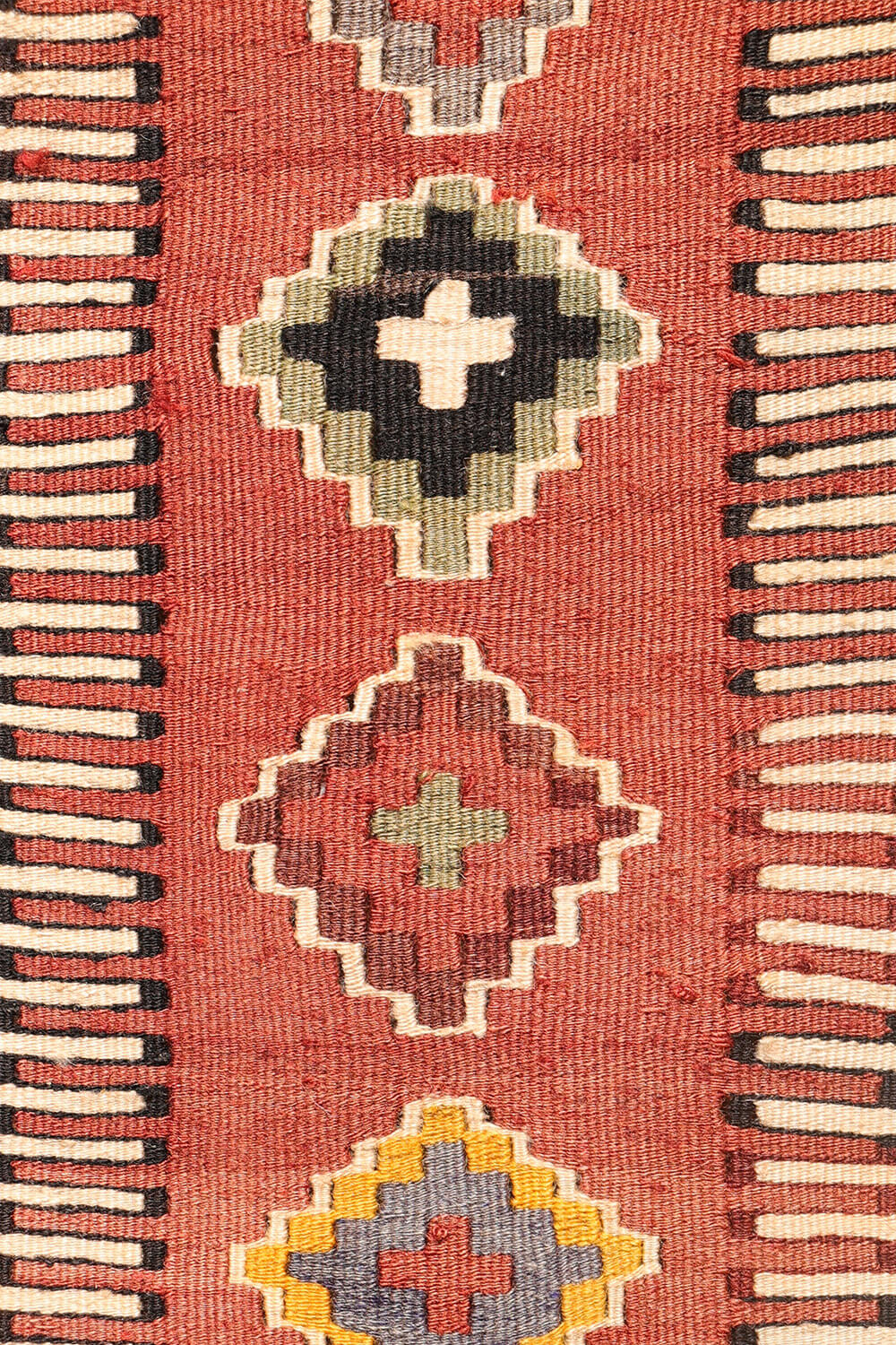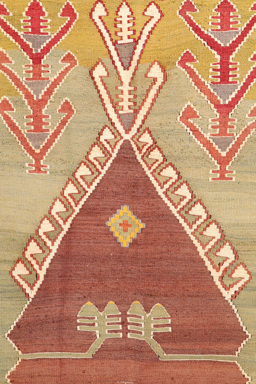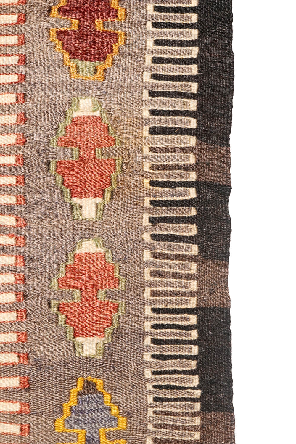 El kilim está tejido con gran finura y muestra un magnífico abrash, o variación de color, especialmente visible en las zonas verdes.