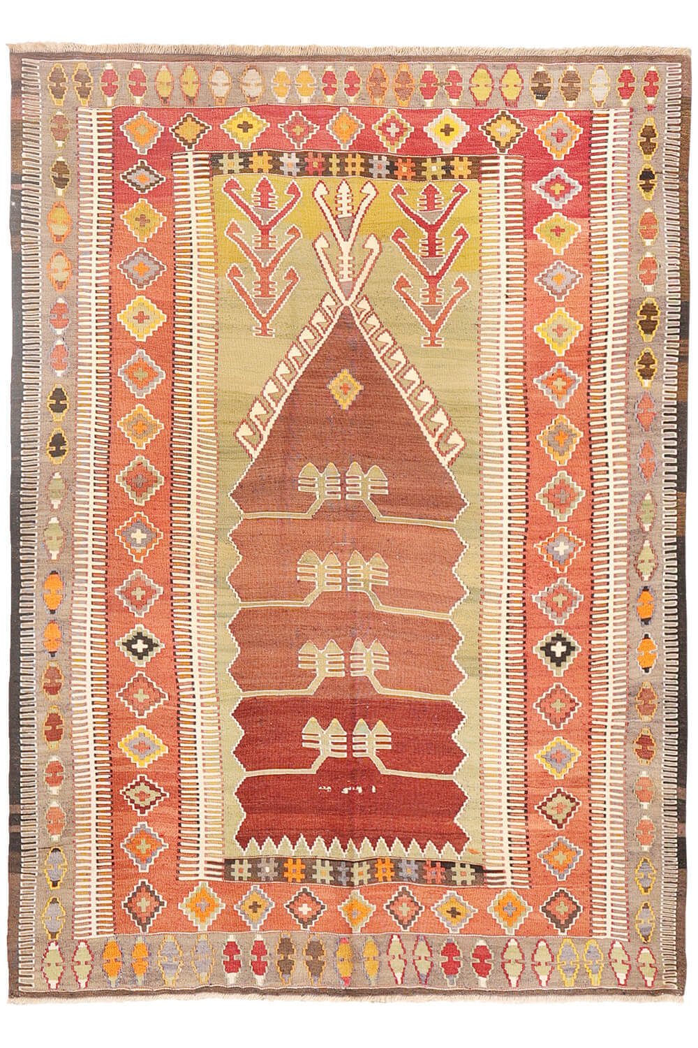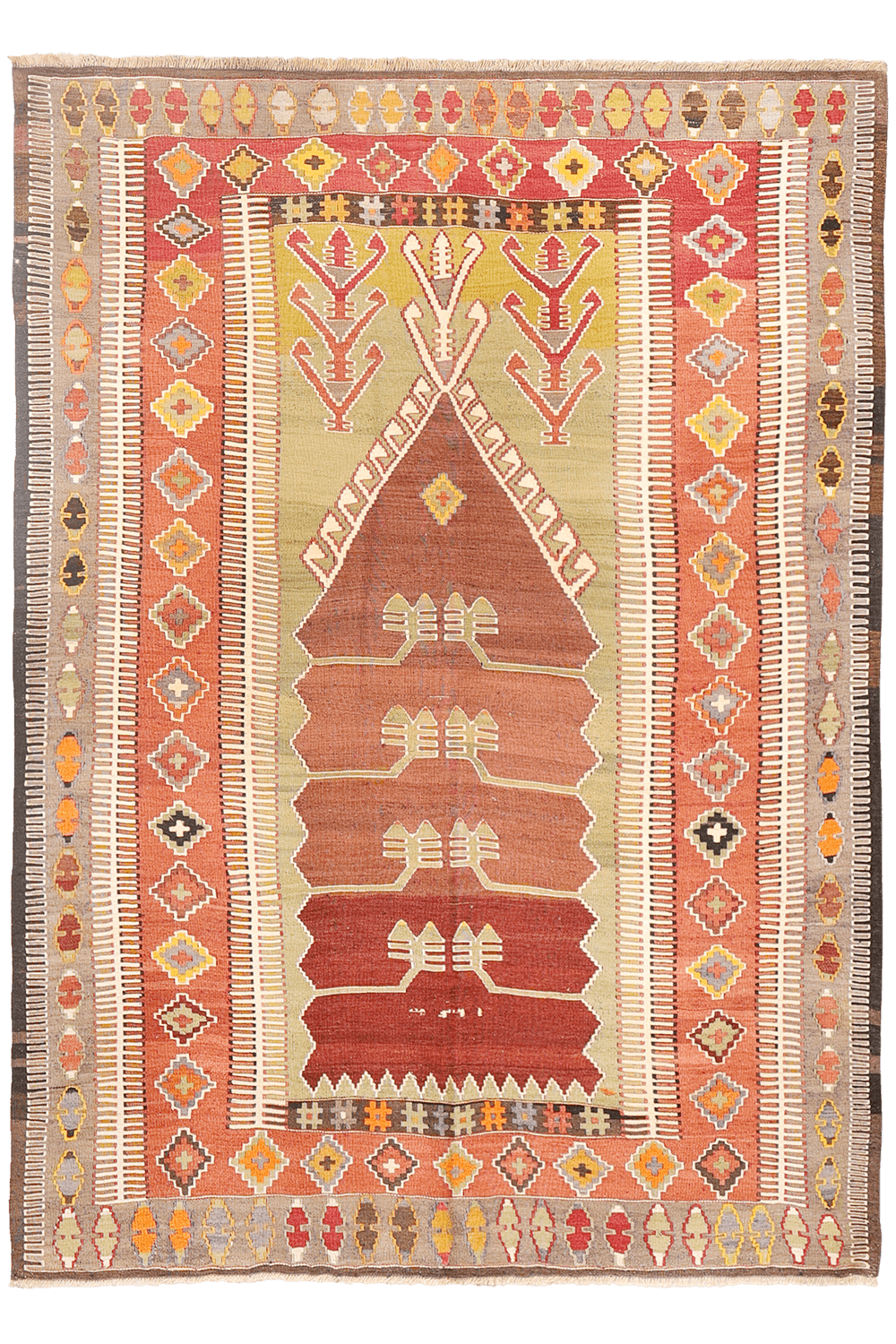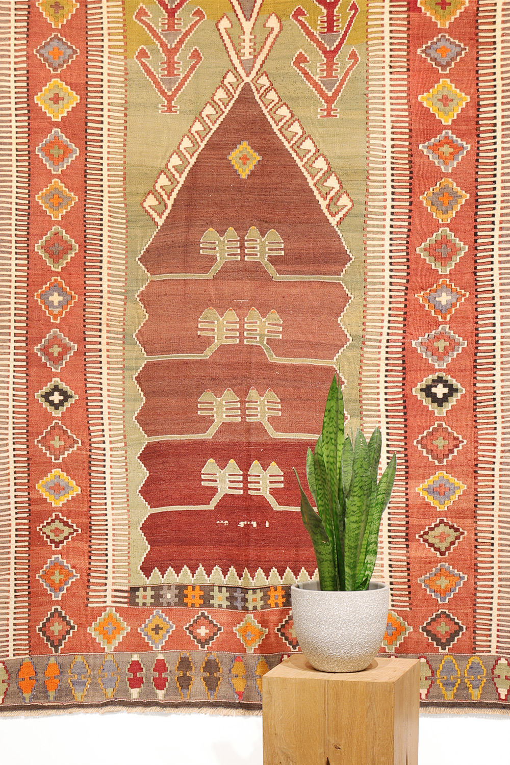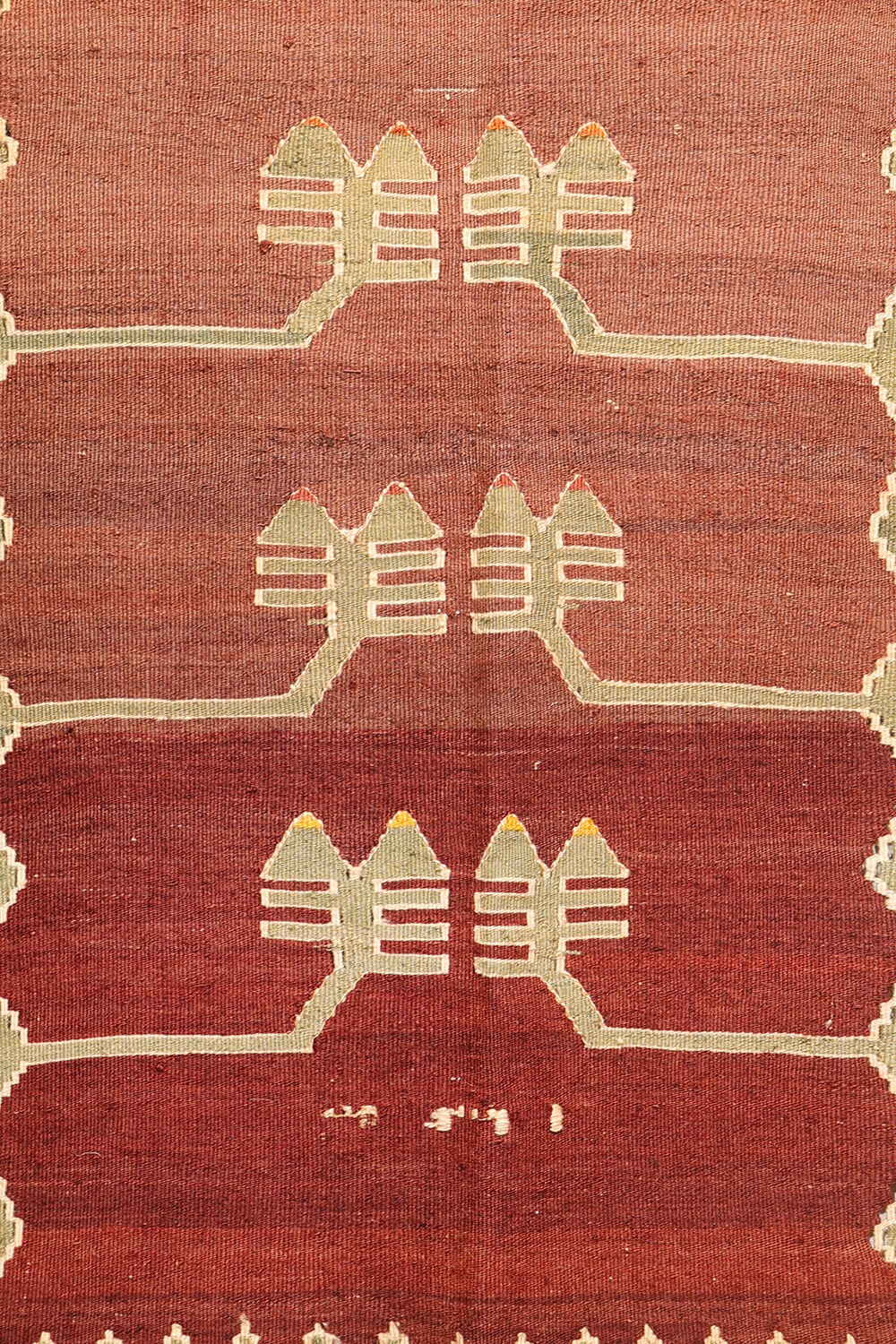 El kilim está tejido con gran finura y muestra un magnífico abrash, o variación de color, especialmente visible en las zonas verdes.