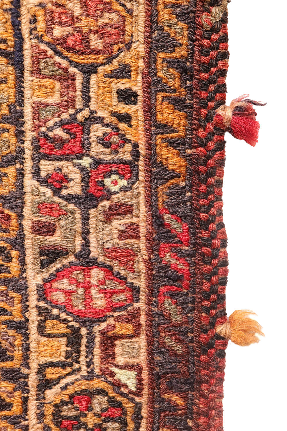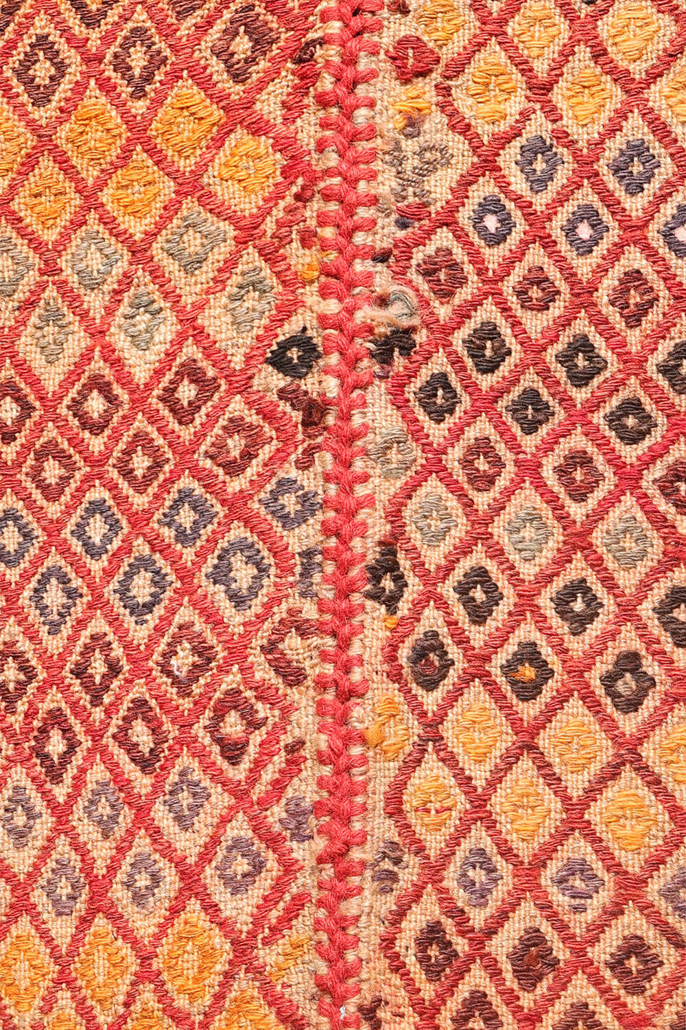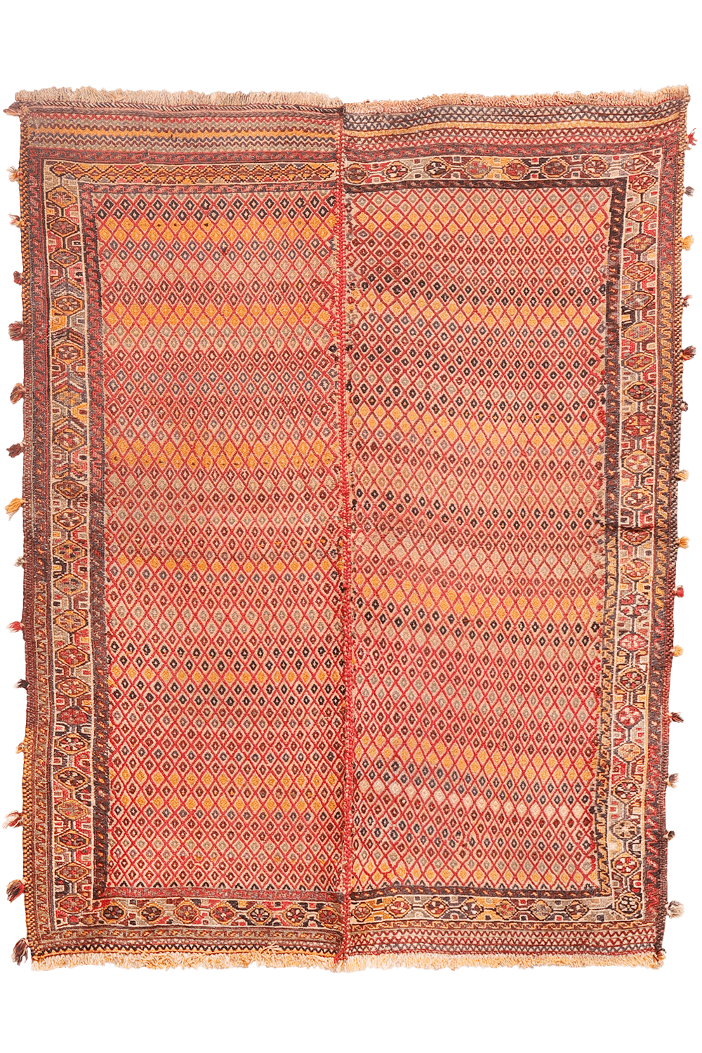 Este tipo de kilim es conocido localmente en el sur de Irán como shiraki, un término que literalmente significa “trabajo de aguja”. Curiosamente, a pesar del nombre, los kilims shiraki se tejen en un telar en lugar de coserse a mano. Tradicionalmente, debido al pequeño tamaño de los telares en las aldeas, estos kilims se elaboraban en dos paneles estrechos que luego se unían cuidadosamente para crear una pieza casi cuadrada, como se puede ver en este ejemplar.