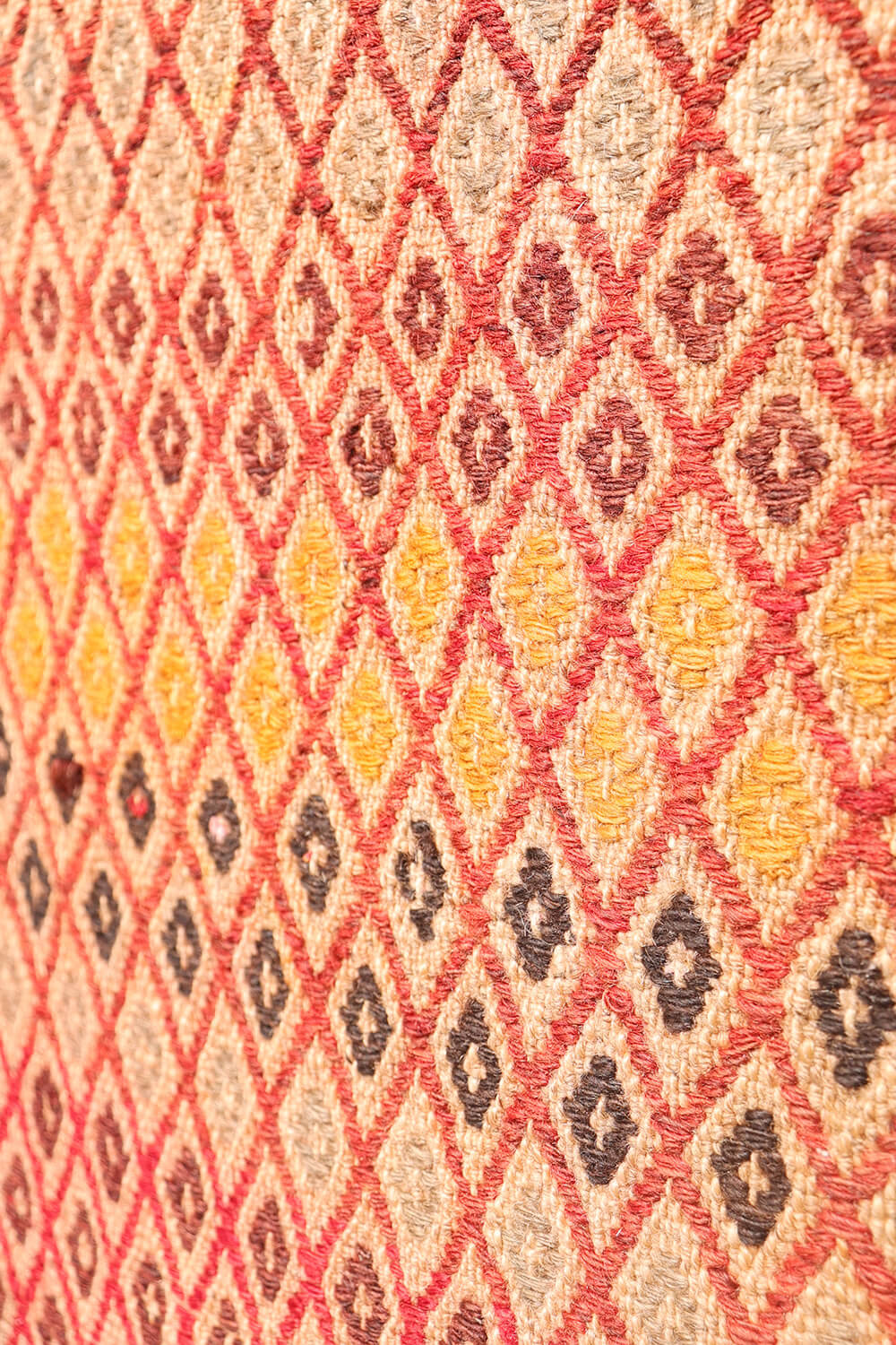 El diseño presenta una cuadrícula estructurada que cubre toda la superficie, con cada cuadrado conteniendo un pequeño motivo que puede representar una flor o servir como protección simbólica contra el mal de ojo. A lo largo del borde corre una serie de motivos geométricos con flores cuyas pétalos han sido tejidos con gran destreza.