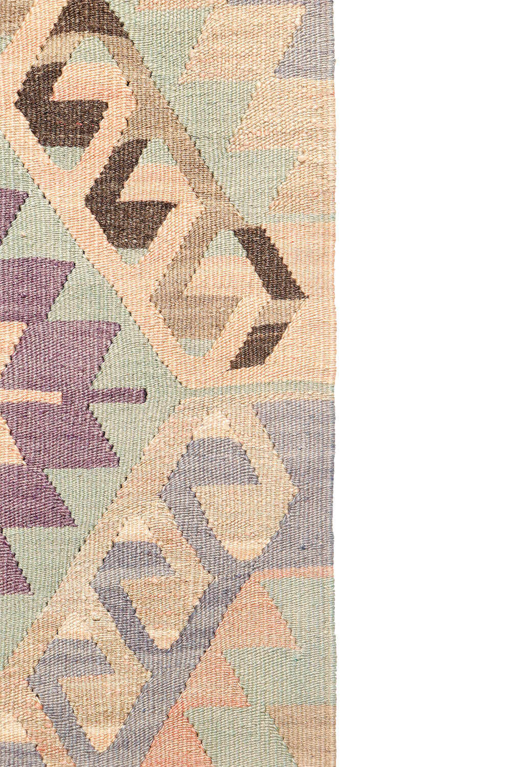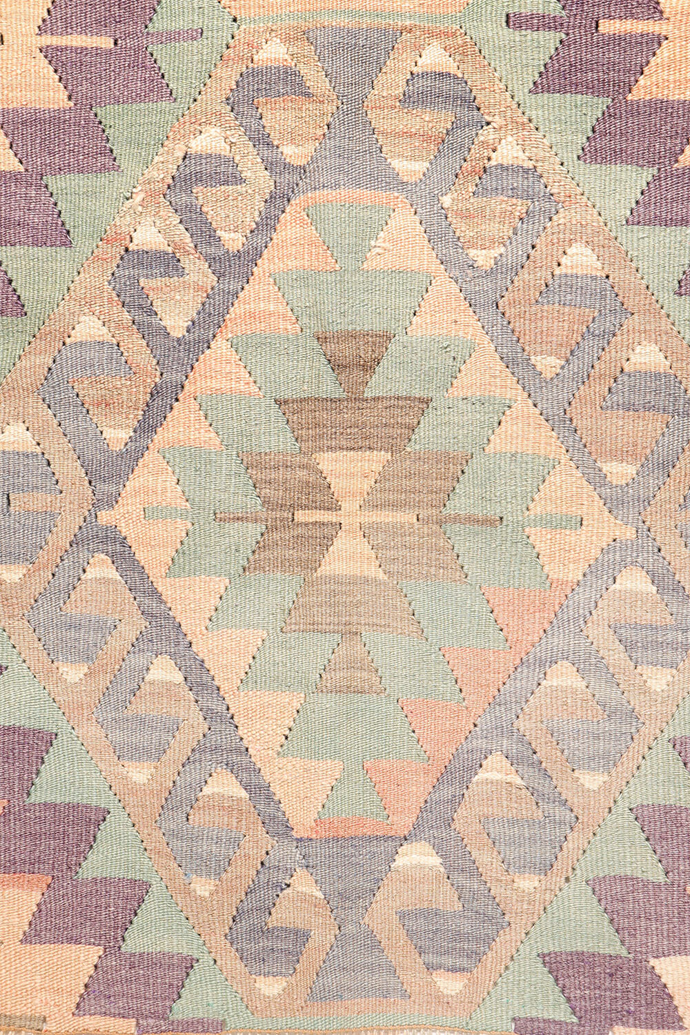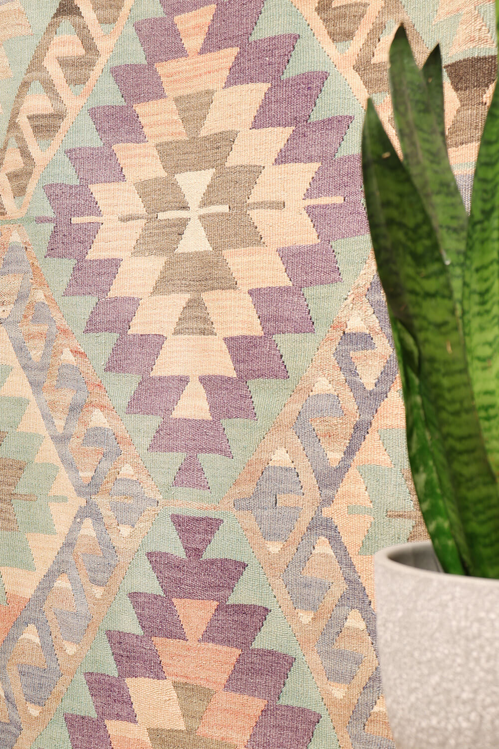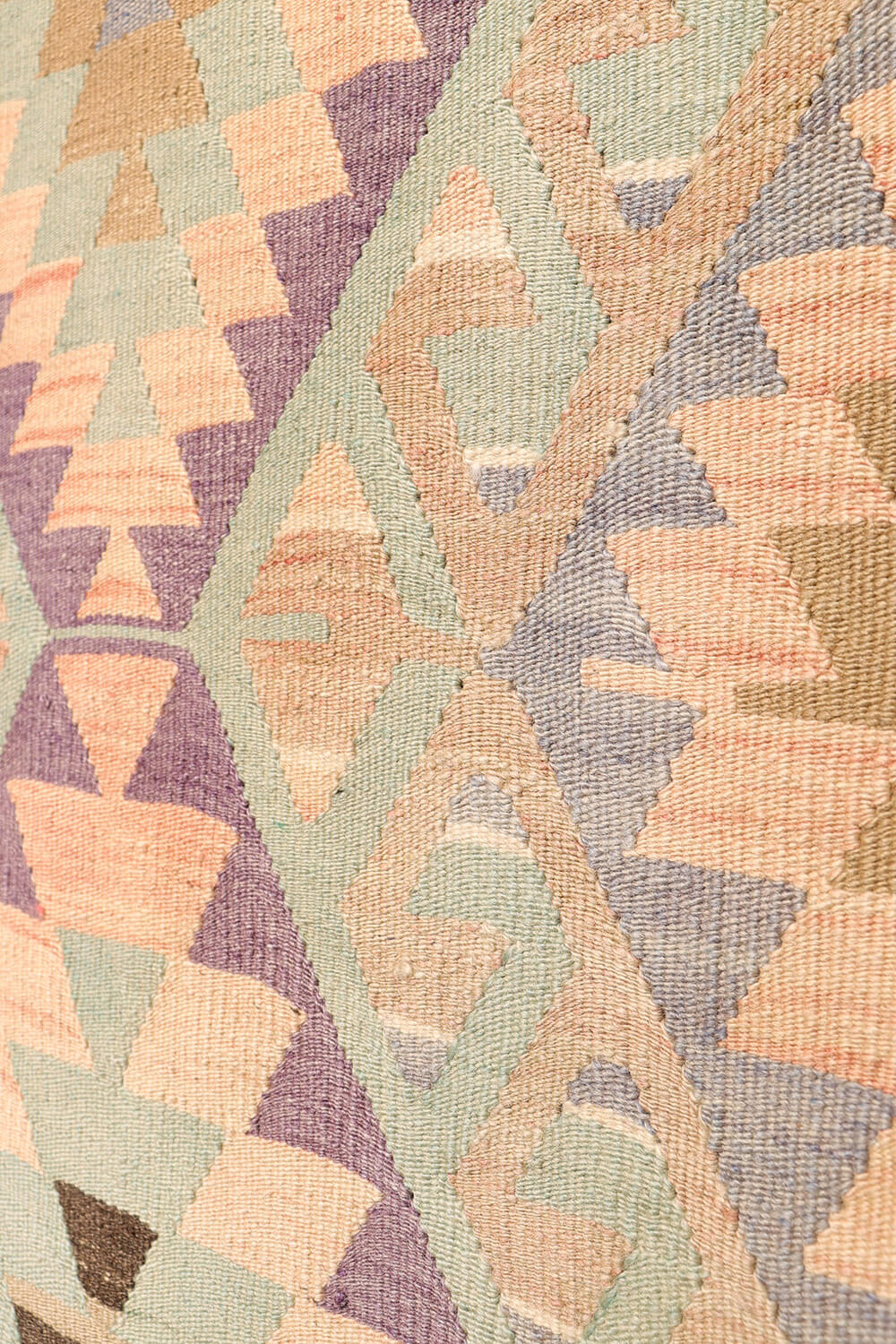 Este kilim vintage de Esme presenta una hermosa paleta de colores pastel. Todo el campo está cubierto por medallones dentados, sin ningún otro diseño secundario, ocupando así por completo la superficie del kilim. El sutil abrash —variaciones naturales de tono dentro de un mismo color— aporta aún más movimiento y profundidad a la composición.