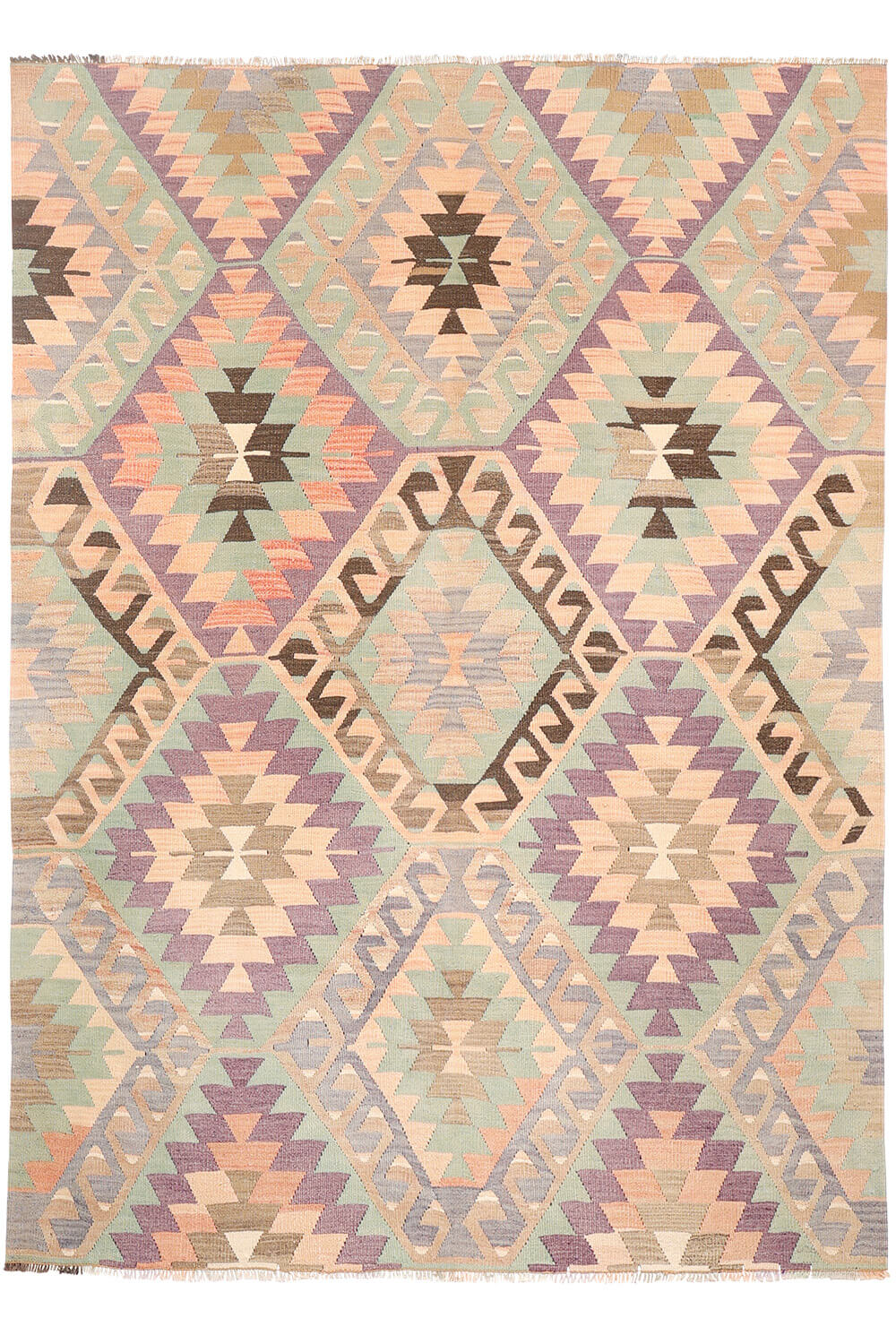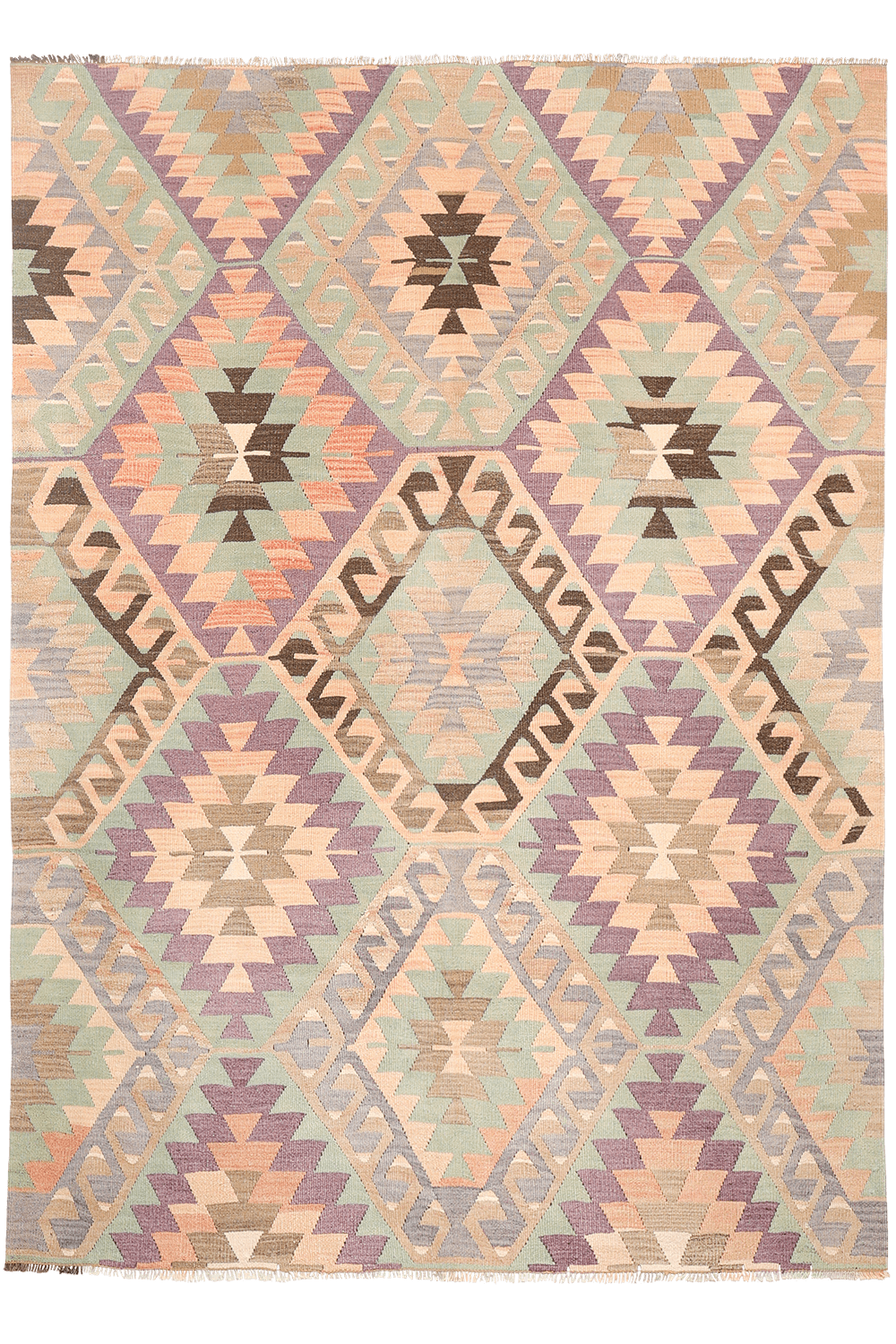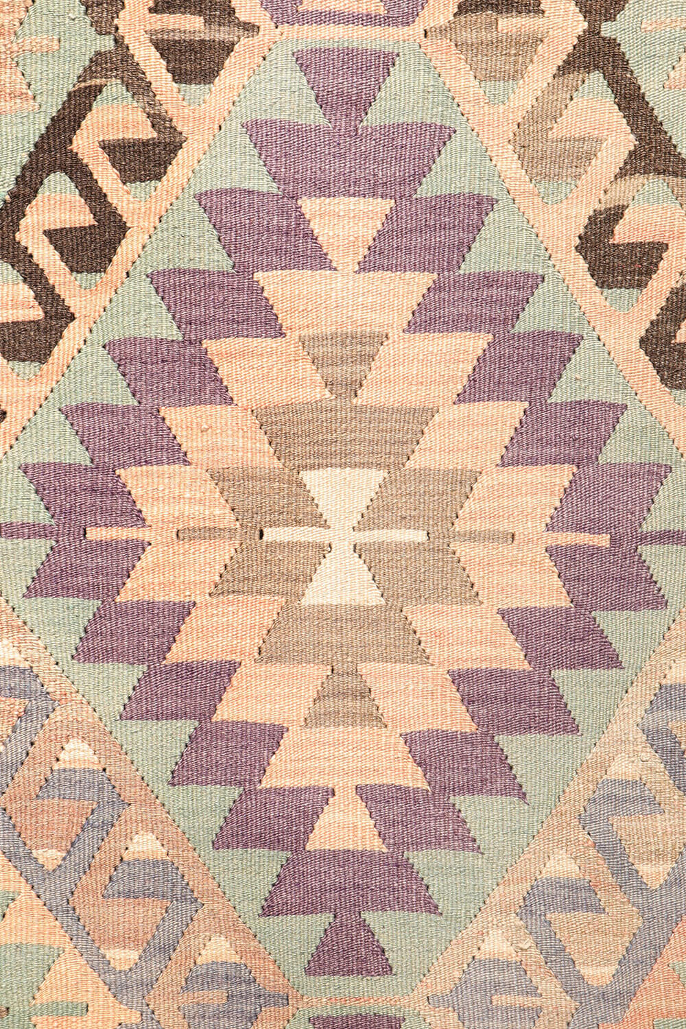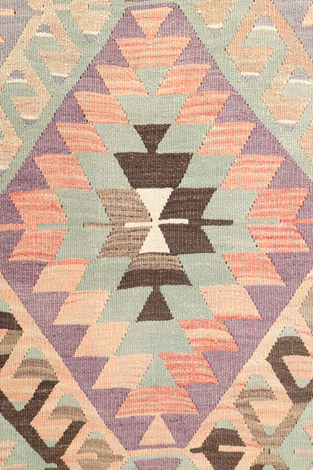 Este kilim vintage de Esme presenta una hermosa paleta de colores pastel. Todo el campo está cubierto por medallones dentados, sin ningún otro diseño secundario, ocupando así por completo la superficie del kilim. El sutil abrash —variaciones naturales de tono dentro de un mismo color— aporta aún más movimiento y profundidad a la composición.