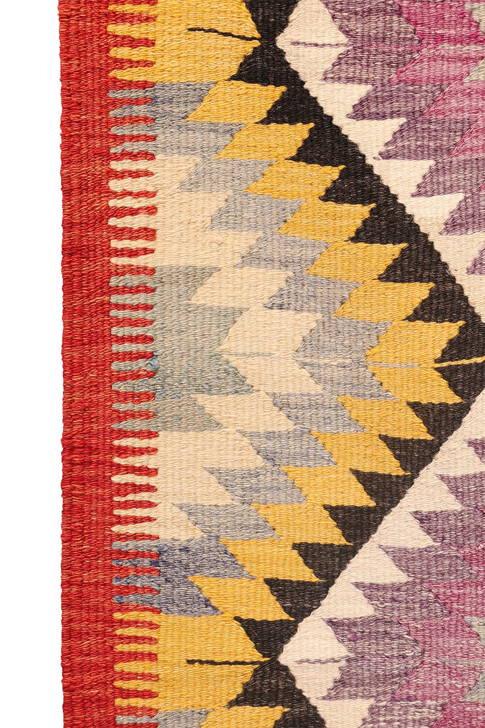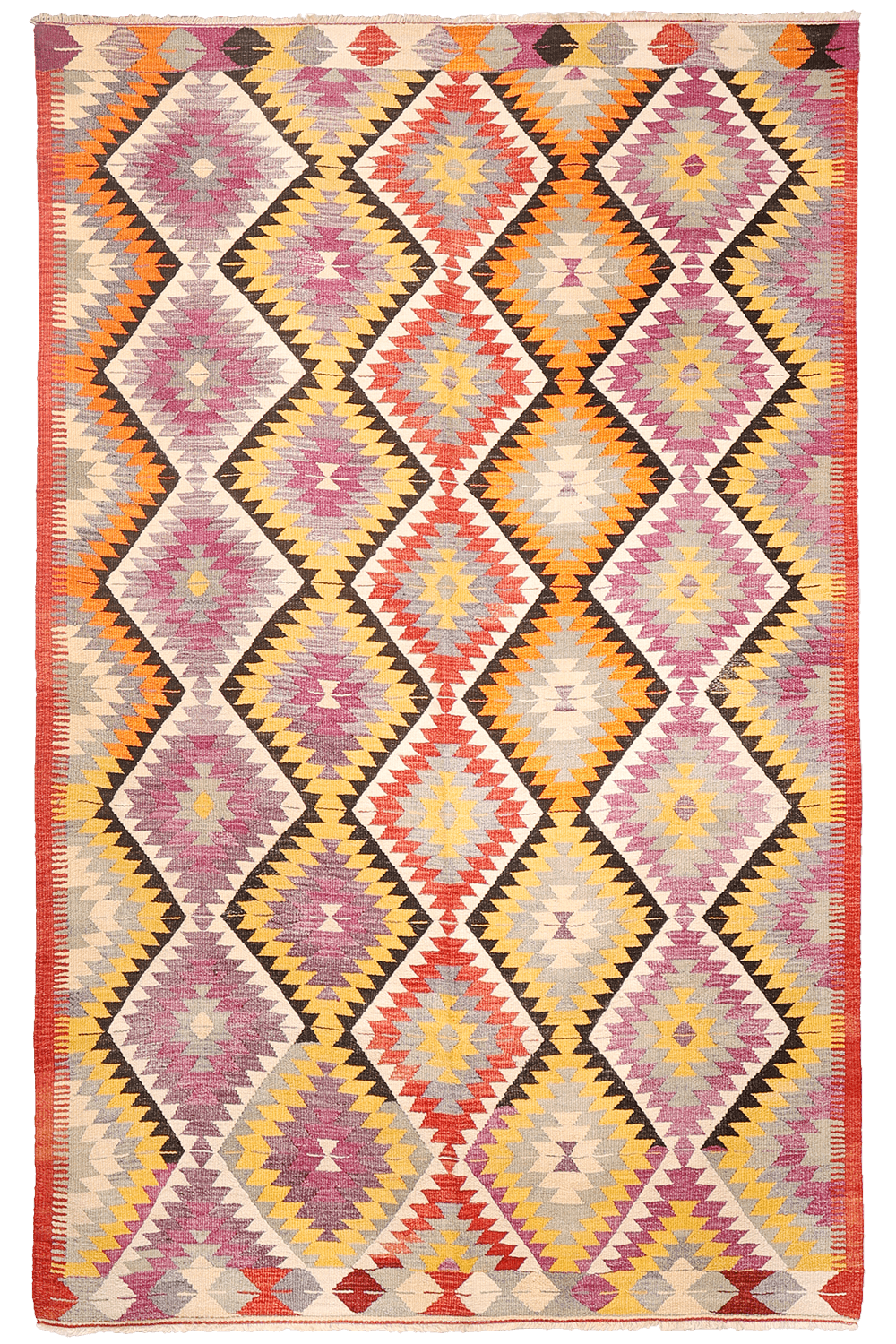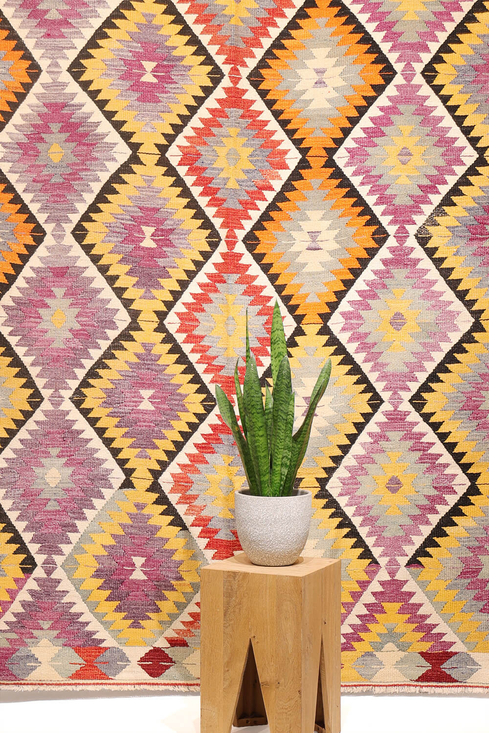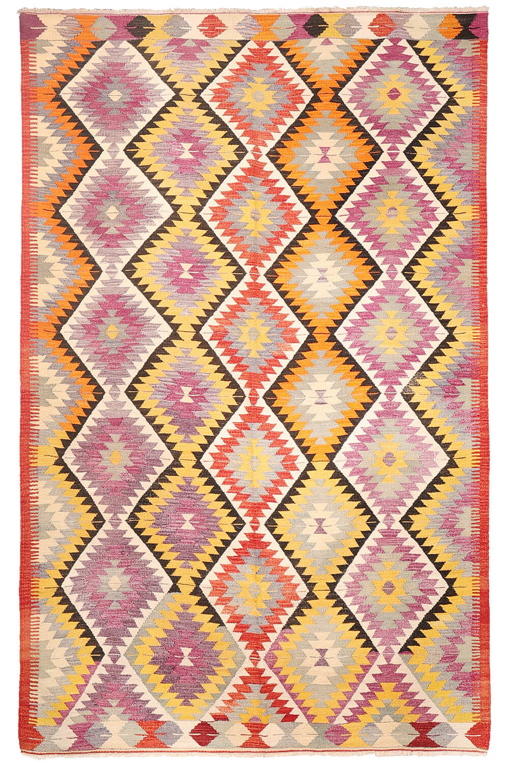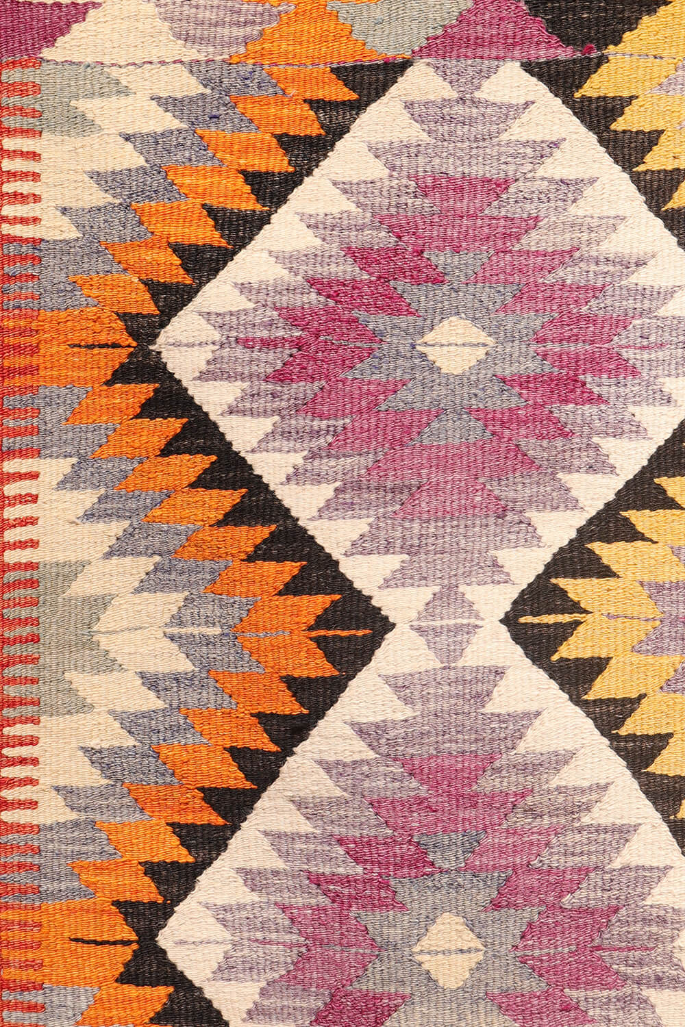 Un kilim vintage de Sutlegen con colores vibrantes y divertidos de Turquía. El diseño se compone de rombos dentados dispuestos verticalmente. La repetición se rompe con la introducción de diferentes colores. Los bordes más largos son estrechos y los dos bordes en los otros dos extremos son ligeramente más anchos. Este kilim es muy grueso y sólido, ideal para zonas de mucho tráfico.