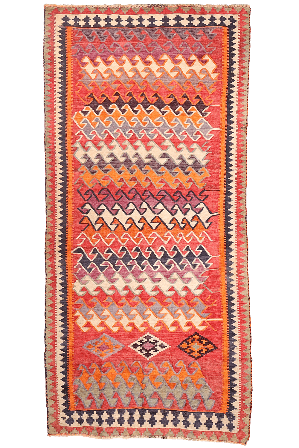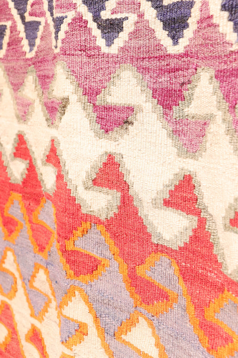 Este kilim fue tejido a mano en un sencillo telar por una tejedora de un pueblo o nómada para uso propio. Probablemente la tejedora empleó lana de sus propias ovejas. Primeramente se limpiaba la lana, se cardaba a mano, se hilaba a mano y finalmente se teñía a mano, a menudo utilizando tintes naturales como raíces, nueces, bayas, frutas, flores y plantas. Los kilims del último cuarto del siglo XX suelen utilizar tintes sintéticos. Este kilim habría tardado muchos meses en completarse.