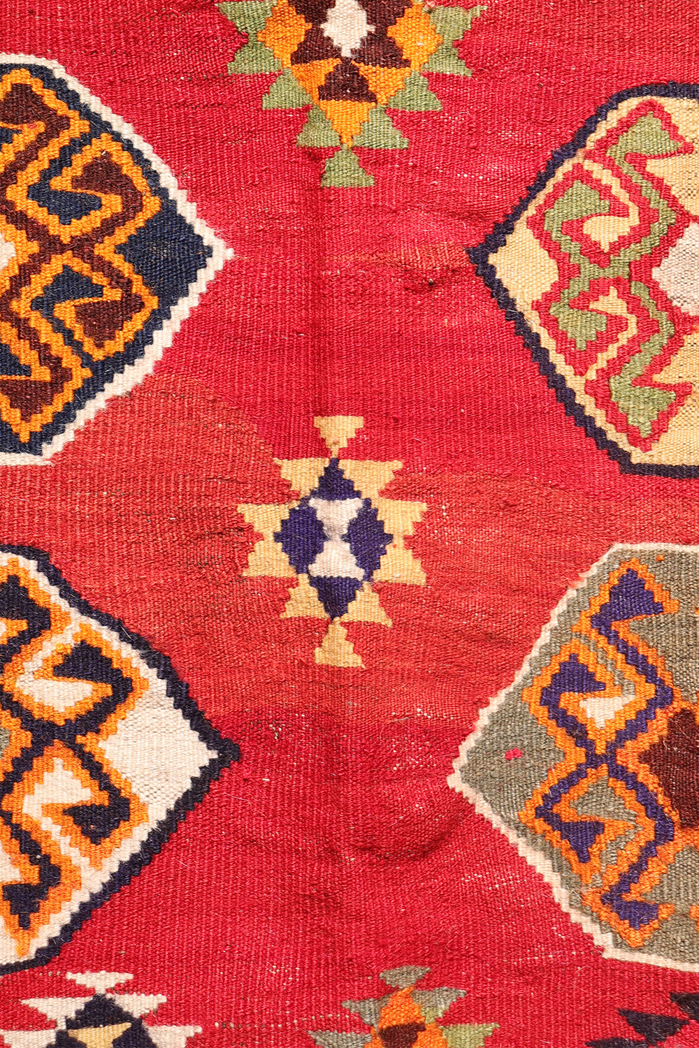 El campo principal presenta un rojo profundo con un hermoso abrash, mostrando sutiles y encantadoras variaciones de color dentro de la gama de rojos.