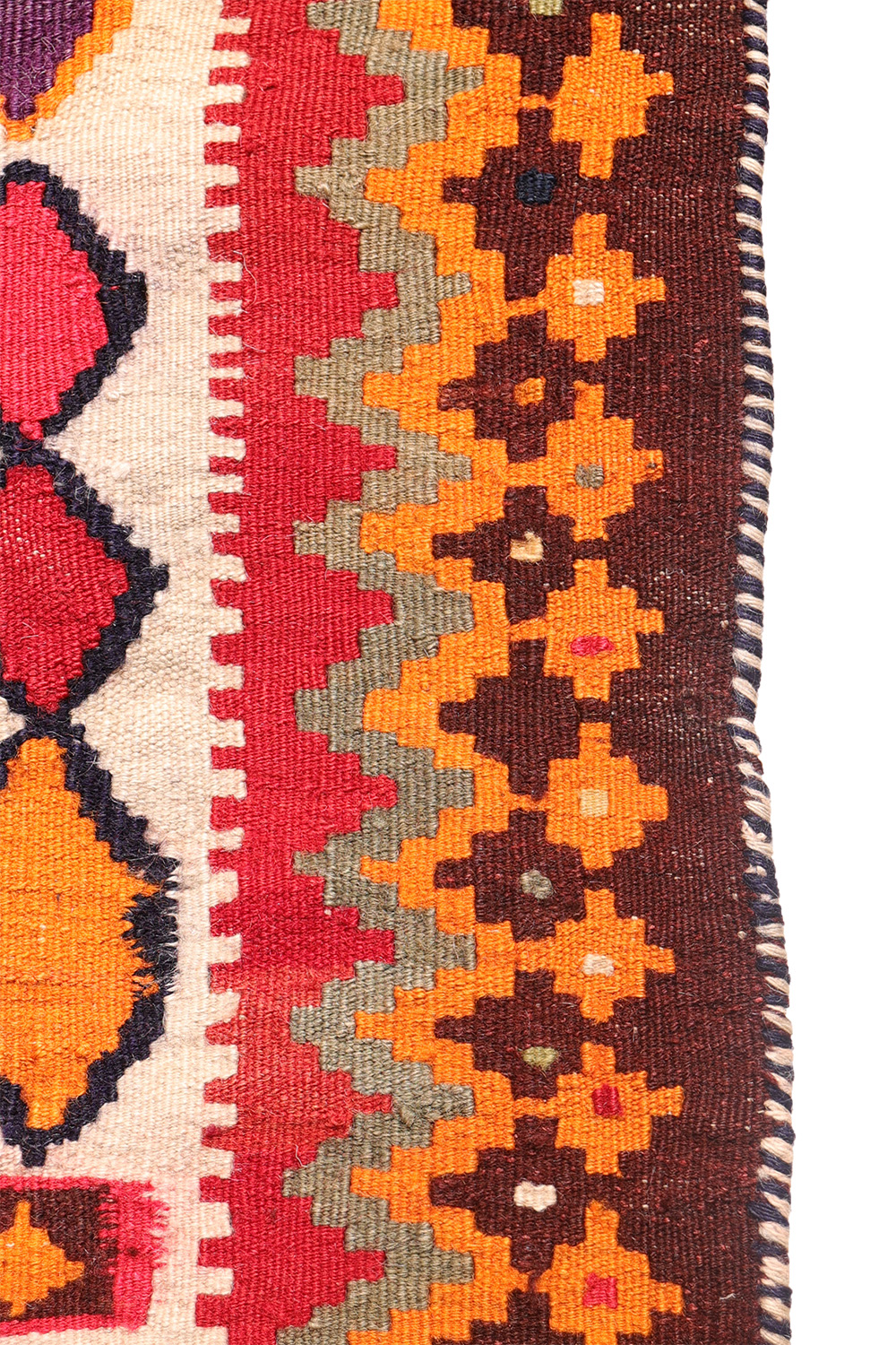 Un alegre kilim Qashqai vintage de Irán, con dos filas verticales del emblema Qashqai, tejido de manera espontánea y elegante. El diseño está lleno de irregularidades y movimiento, con motivos de formas y tamaños ligeramente distintos y colores organizados de manera aparentemente aleatoria pero armoniosa.