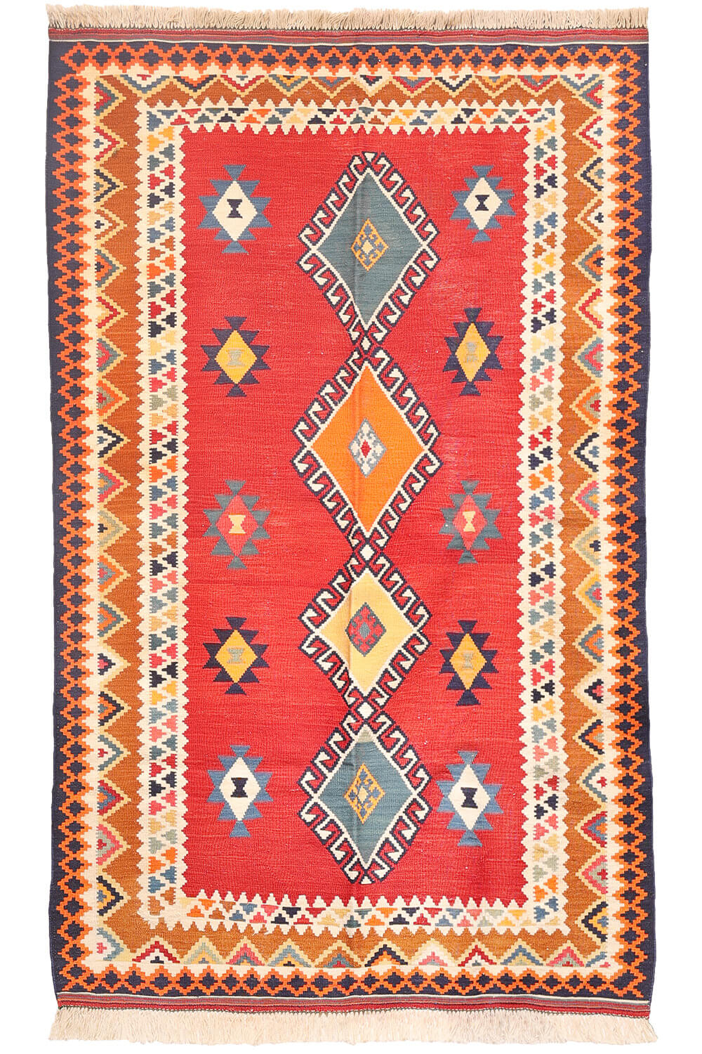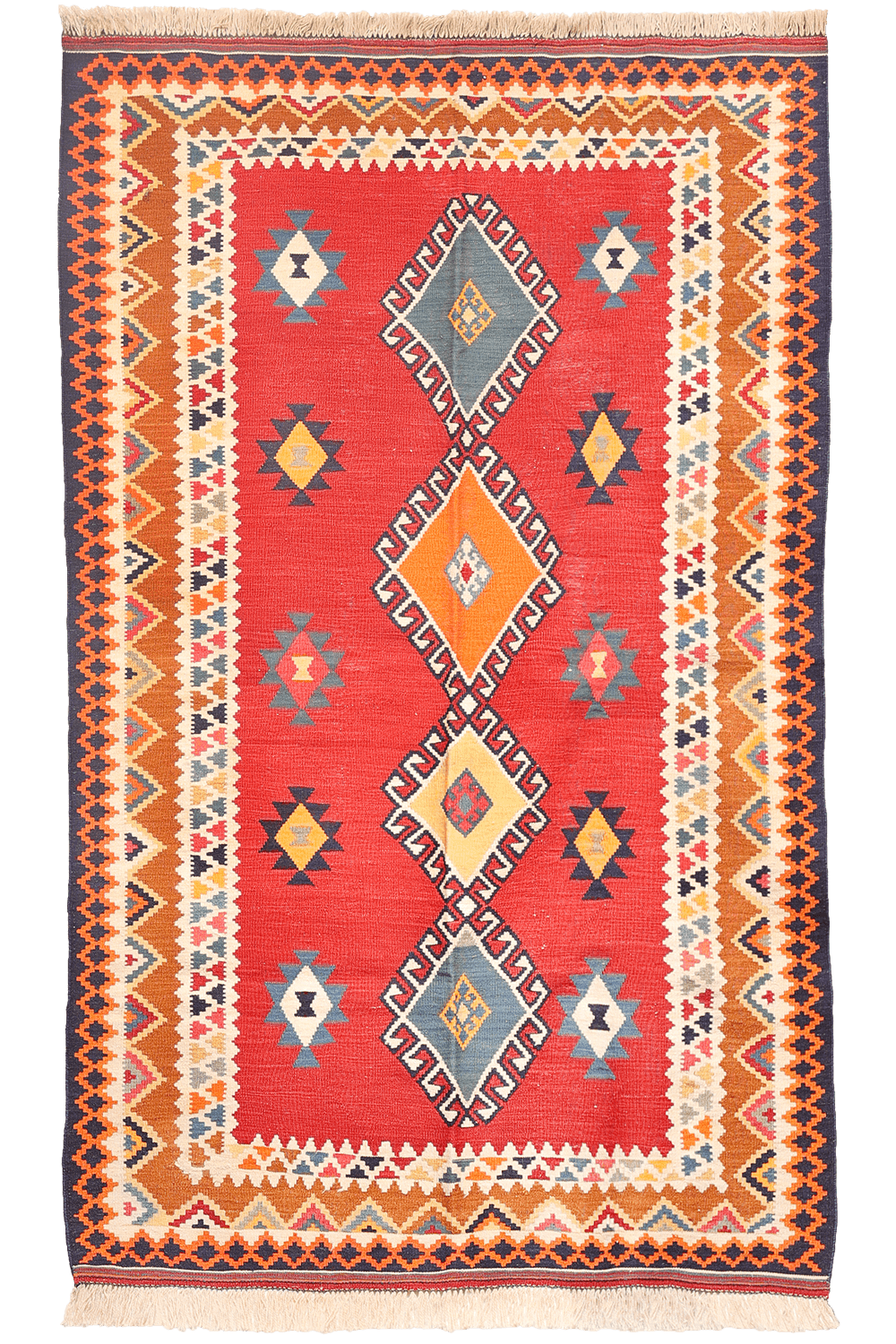 Un kilim Qashqai vintage con un campo de un rojo profundo, sobre el que se disponen cuatro grandes medallones. El resto del espacio del campo principal está ocupado por motivos más pequeños, creando una composición rítmica y equilibrada.