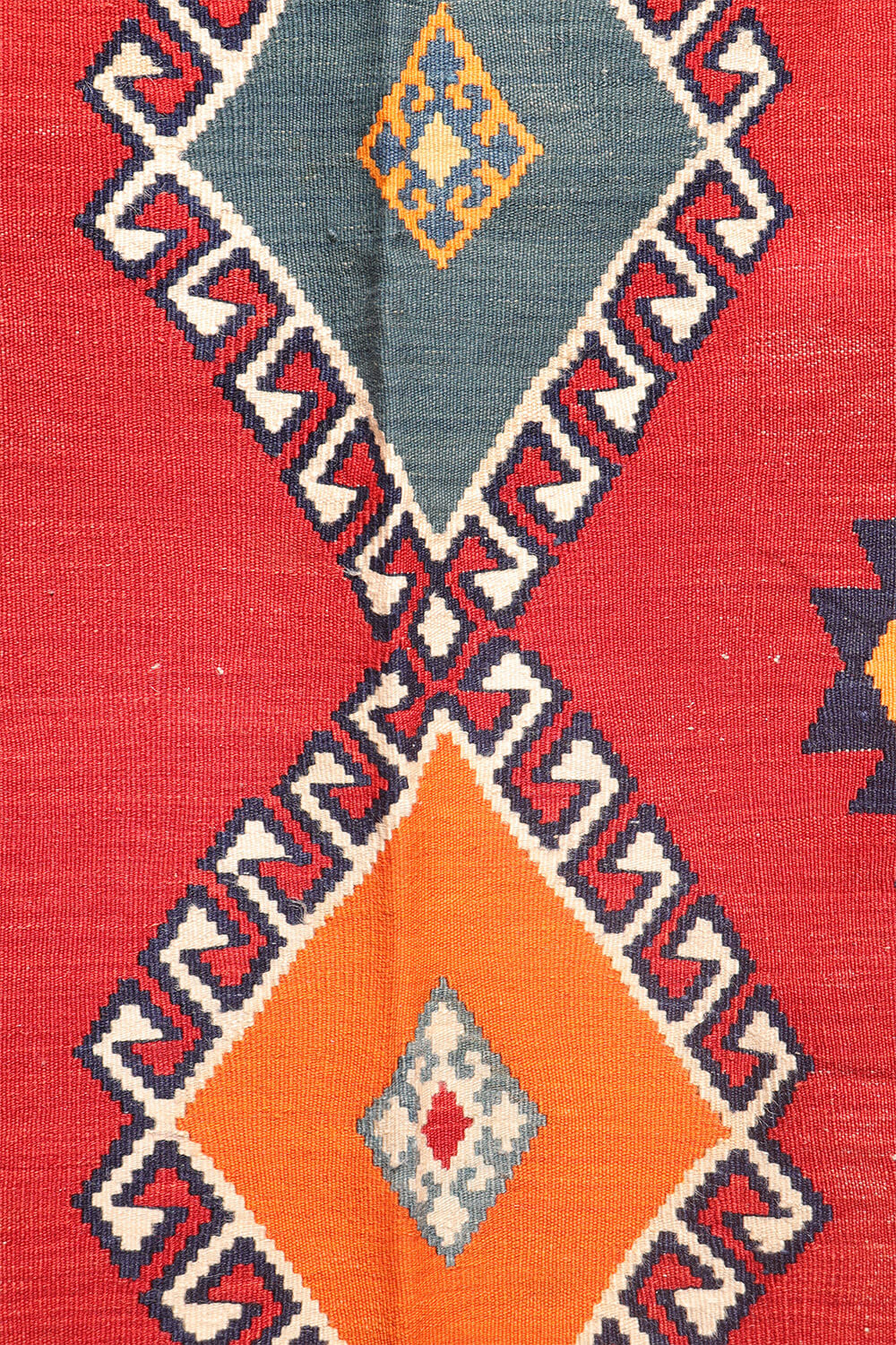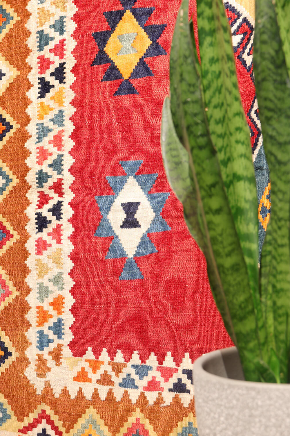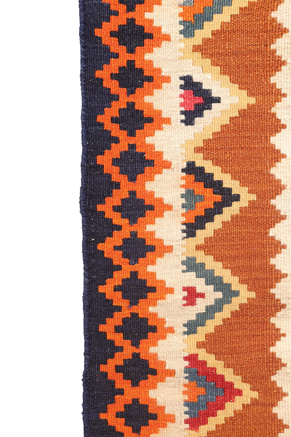 Los múltiples bordes, elaborados y bien diseñados, están finamente tejidos y bien proporcionados. Este kilim fue realizado con lana finamente hilada, lo que le confiere durabilidad y una textura refinada.